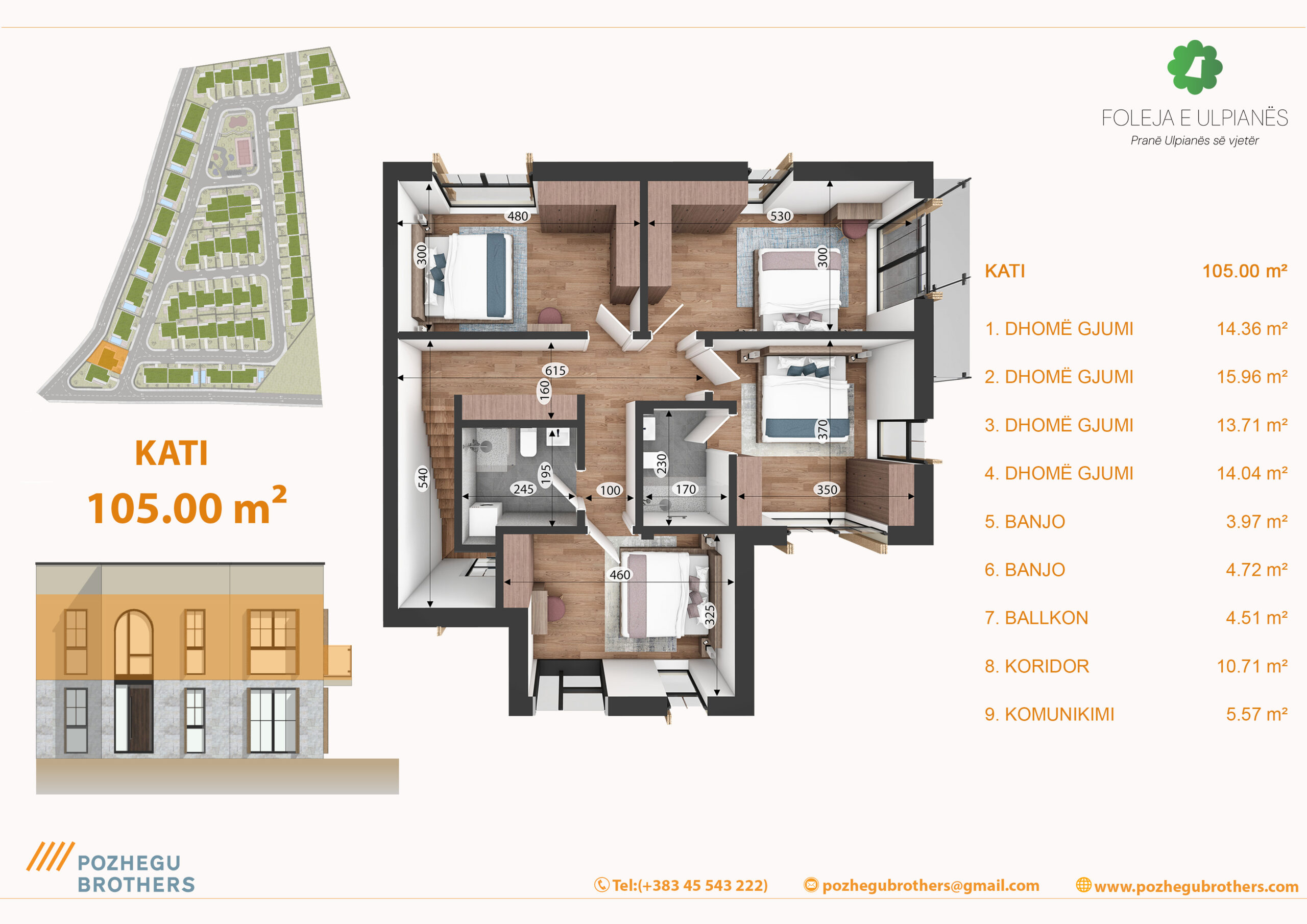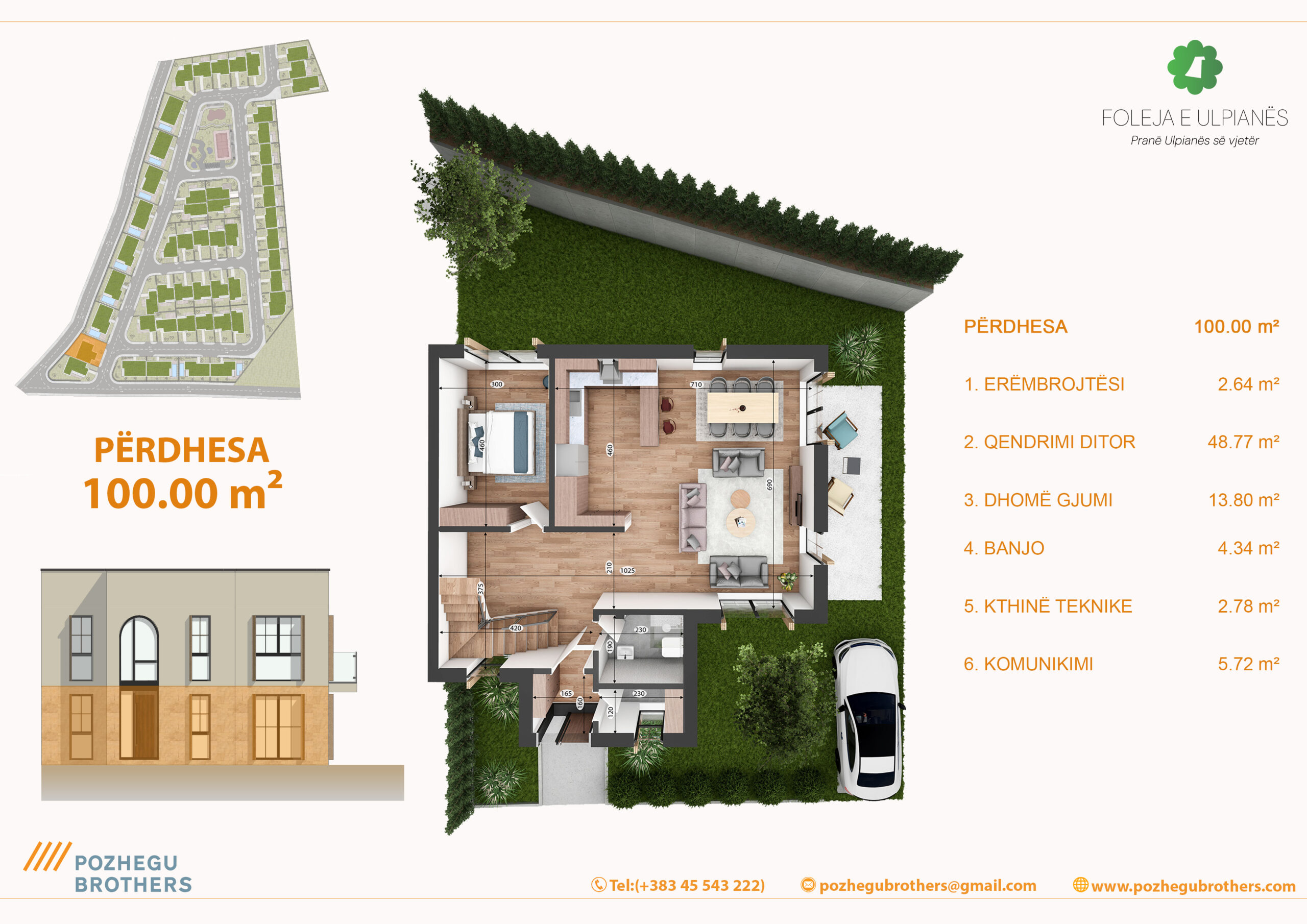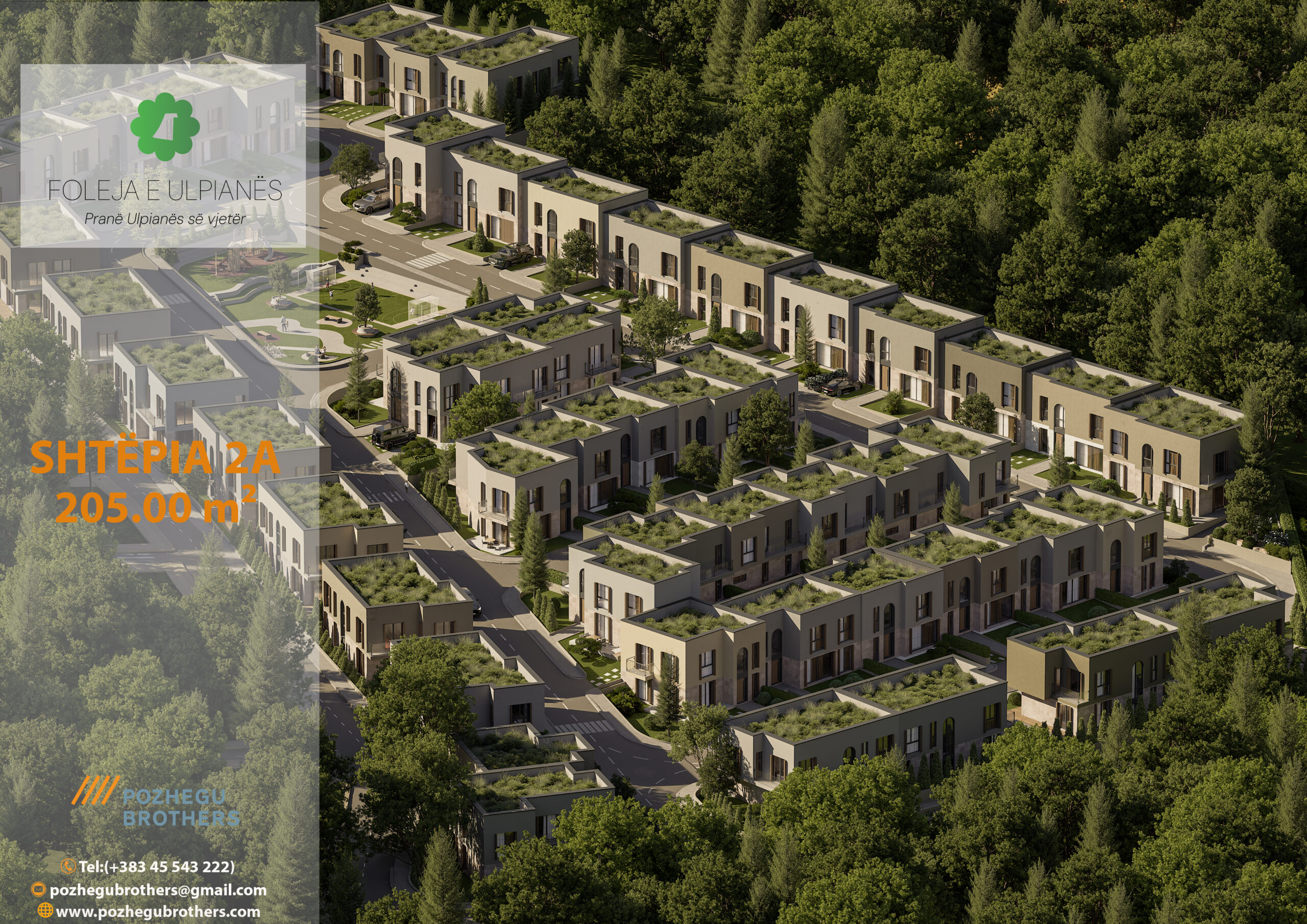 Shtëpia është me dy kate, e organizuar në mënyrë funksionale për jetesë familjare. Kati përdhesë përfshinë hapësirat ditore – sallonin, kuzhinën me tryezari, dhomë gjumi, banjo dhe kthinën teknike . Kati lartë përmban 4 dhoma të gjumit, 2 banjo dhe ballkonin. Dritaret e mëdha lejojnë ndriçimin natyror të hyjë gjatë gjithë ditës, ndërsa orientimi është i planifikuar për të përfituar maksimalisht nga drita dhe pamja.