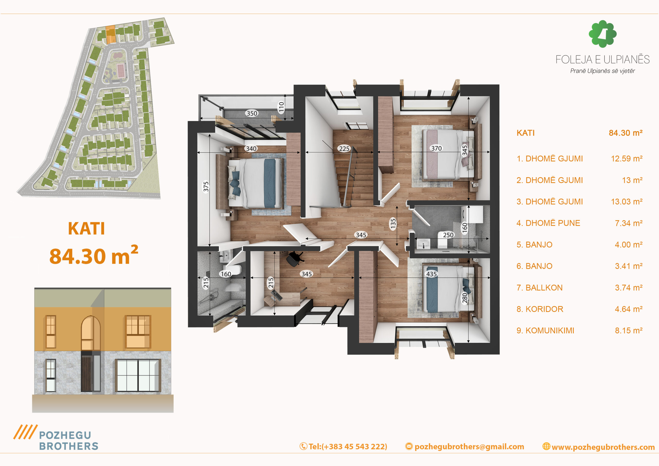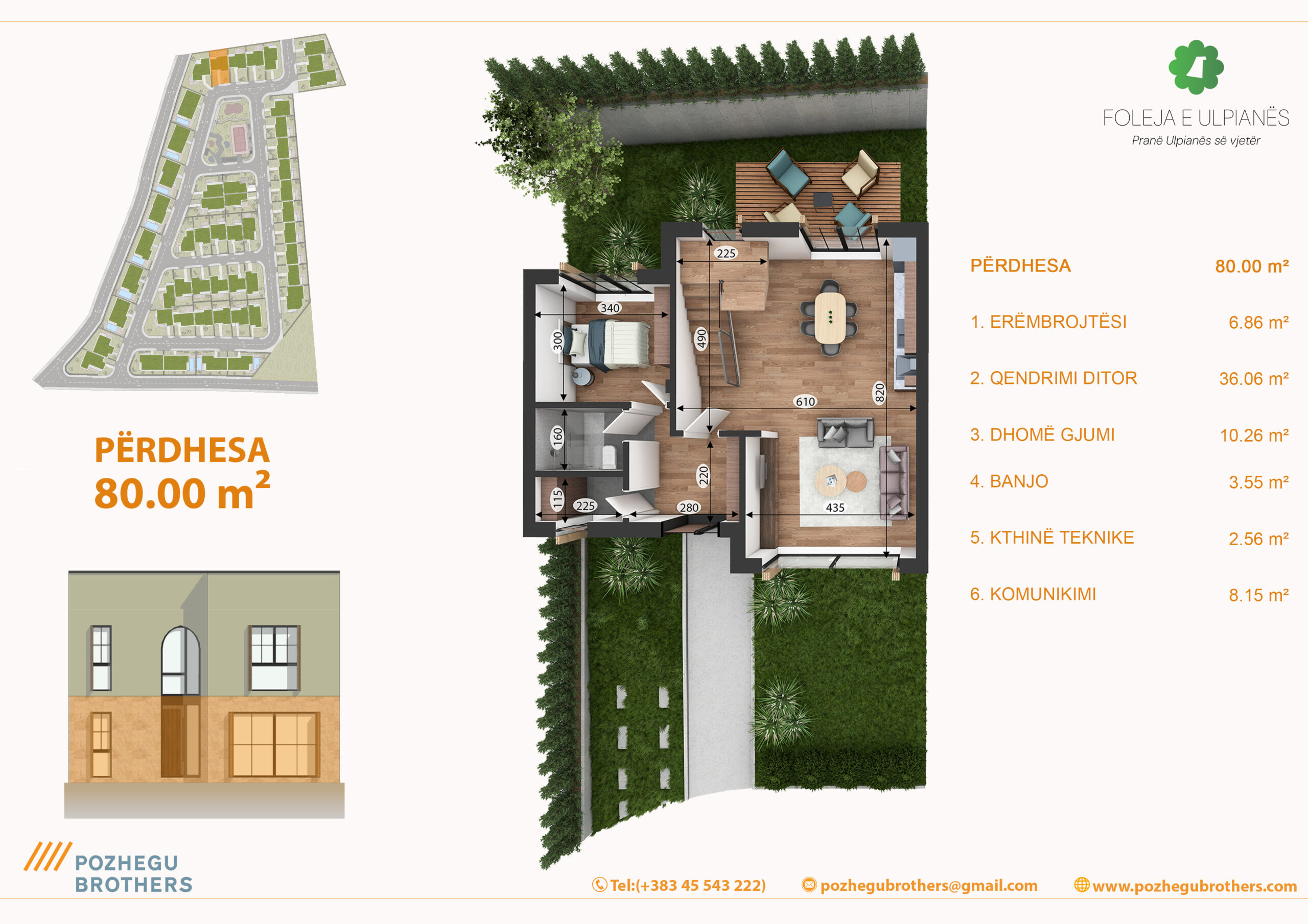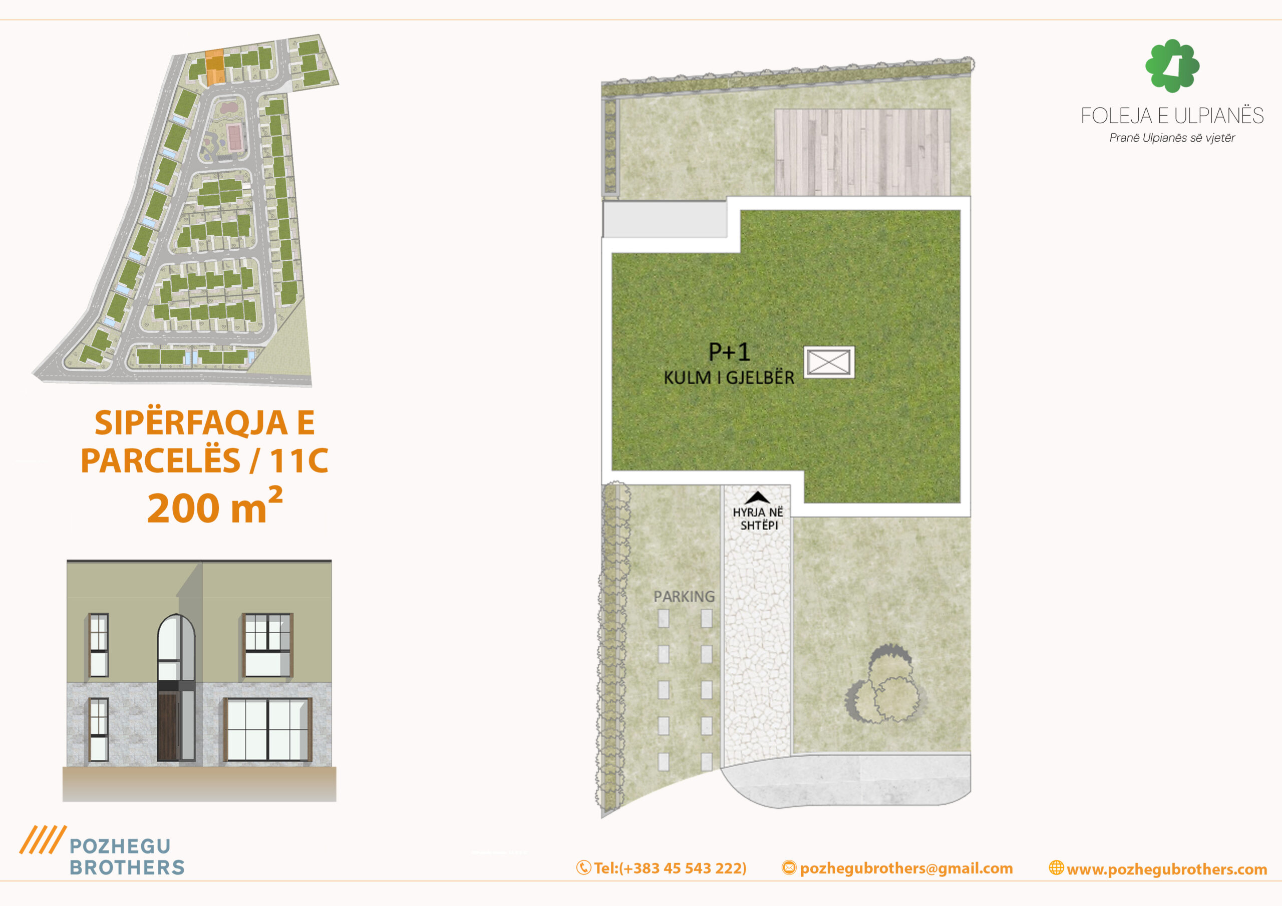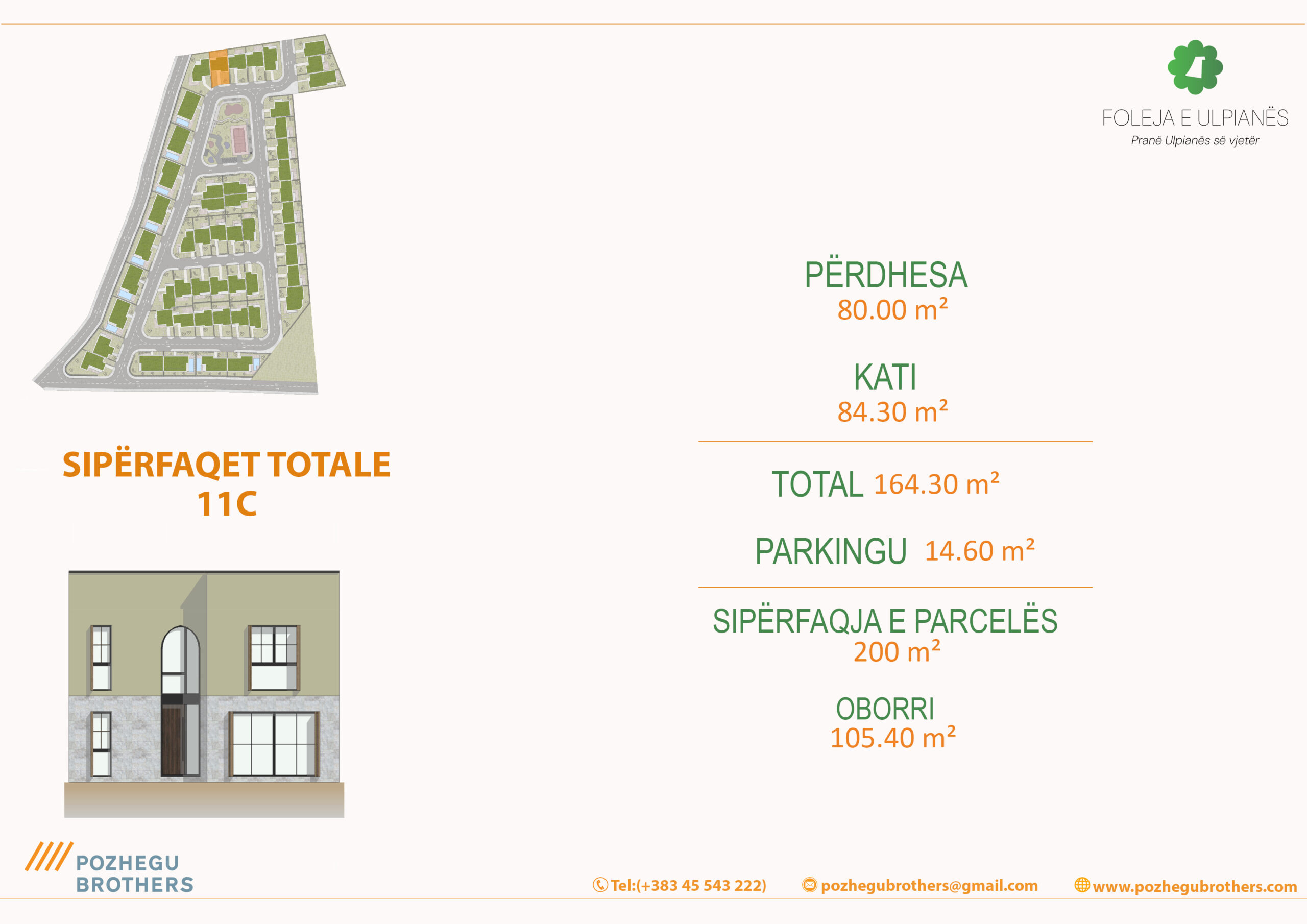 Shtëpia është me dy kate, e organizuar në mënyrë funksionale për jetesë familjare. Kati përdhesë përfshinë hapësirat ditore – sallonin, kuzhinën me tryezari, dhomë gjumi, banjo dhe kthinën teknike. Kati lartë përmban 3 dhoma të gjumit, dhomë pune, 2 banjo, dhe ballkonin. Dritaret e mëdha lejojnë ndriçimin natyror të hyjë gjatë gjithë ditës, ndërsa orientimi është i planifikuar për të përfituar maksimalisht nga drita dhe pamja.