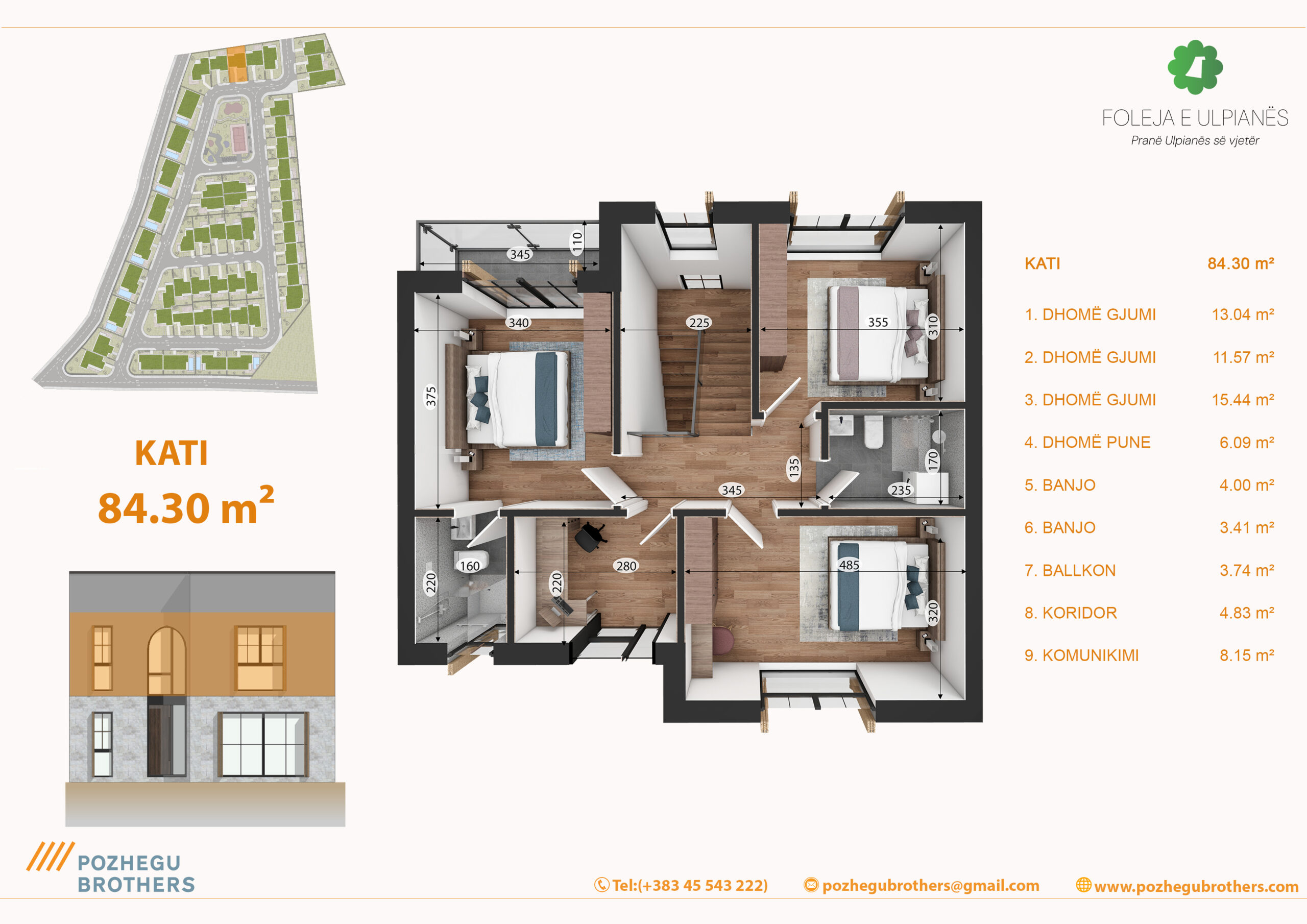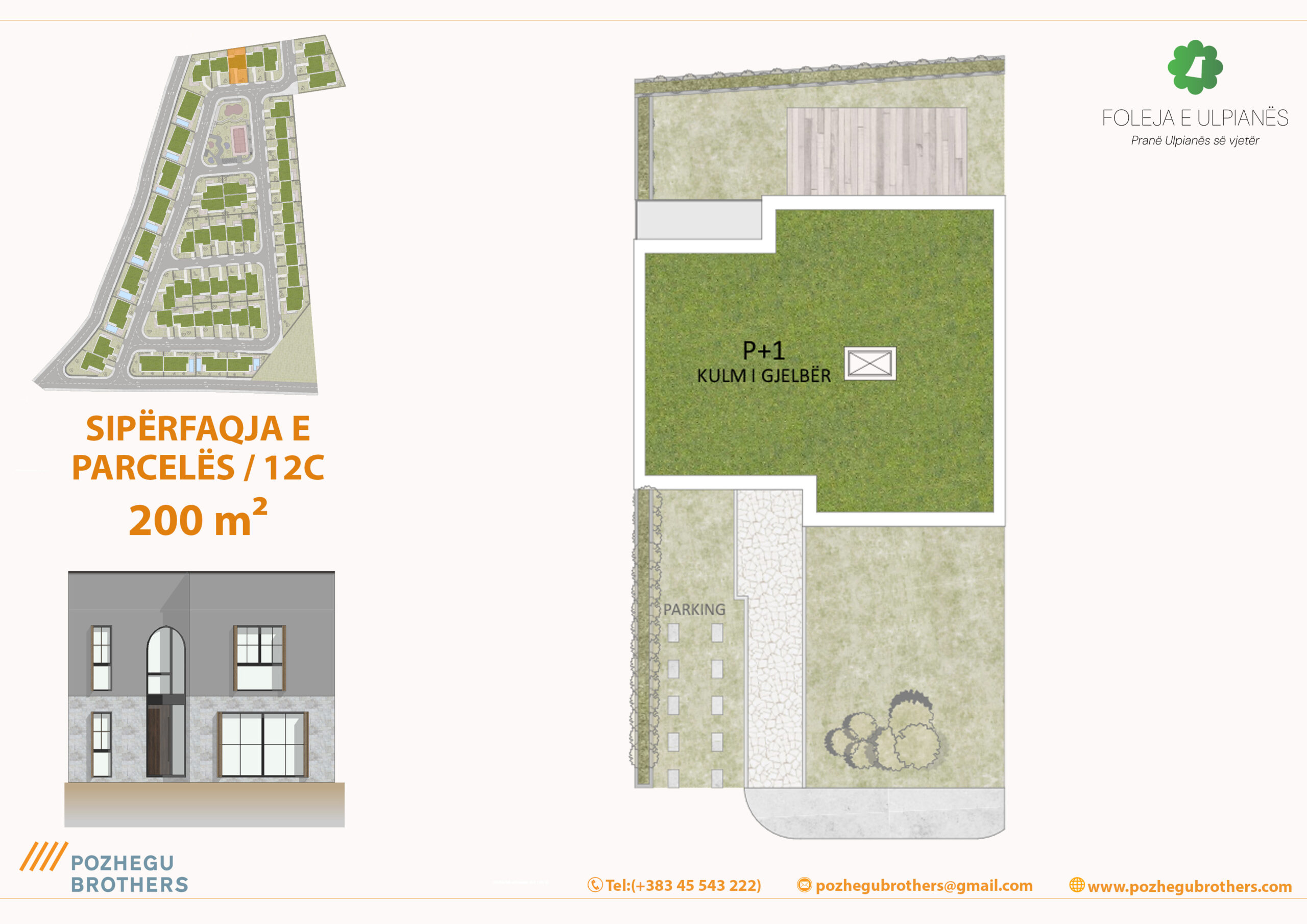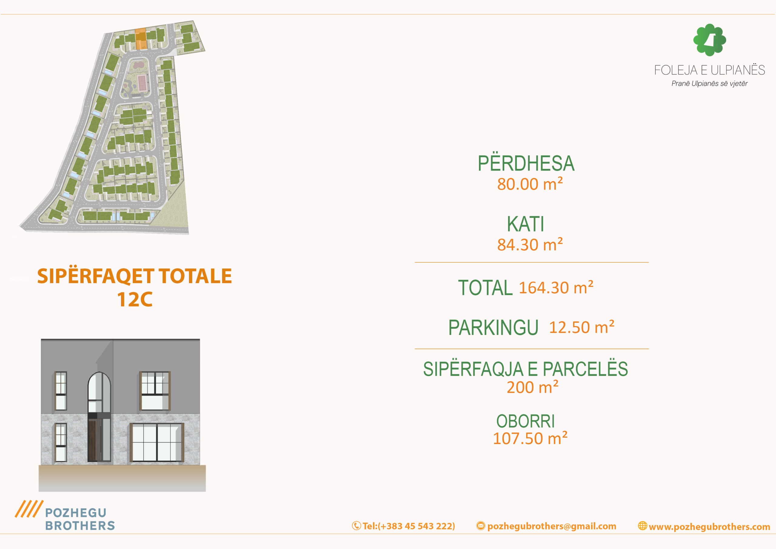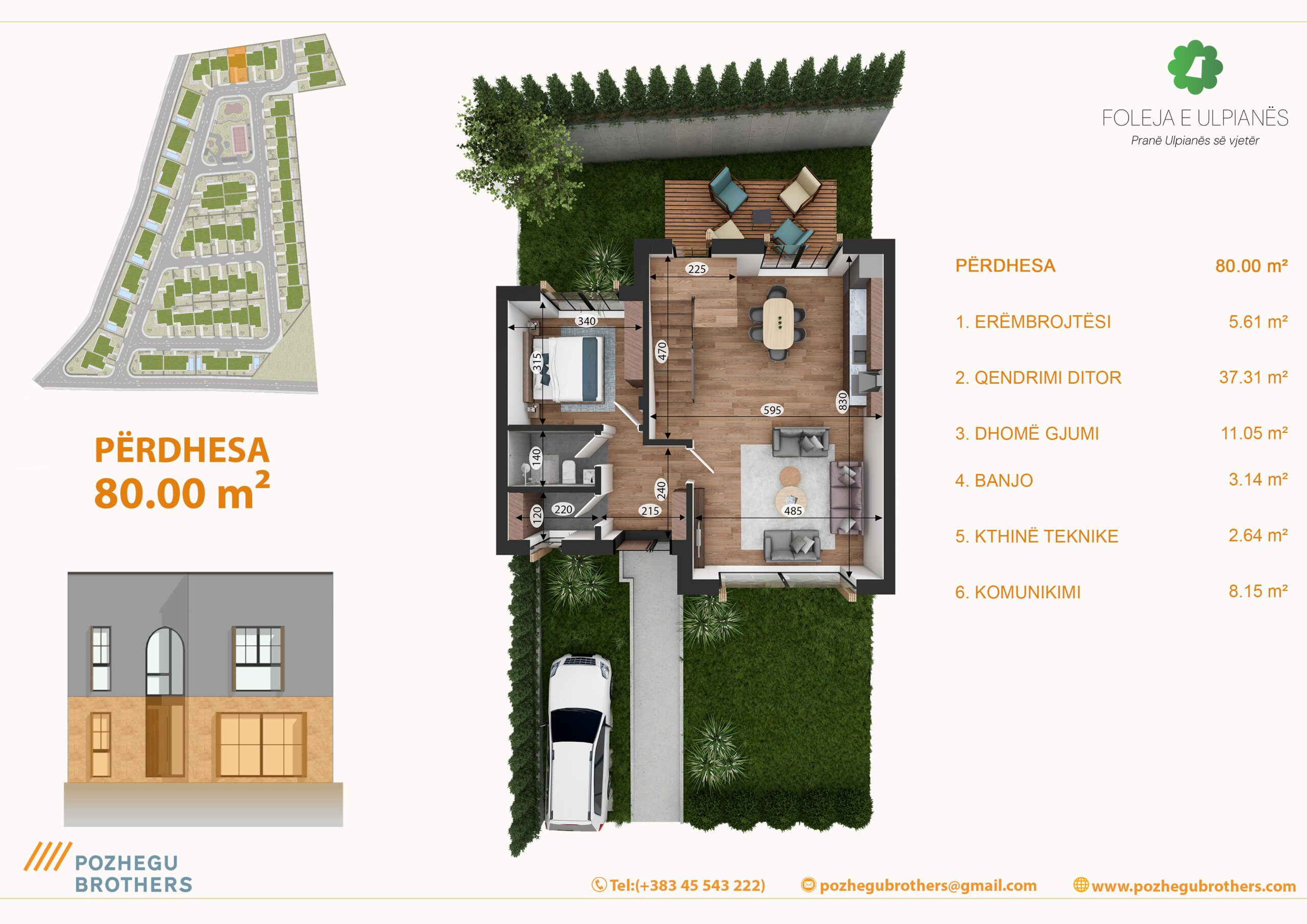 Shtëpia është me dy kate, e organizuar në mënyrë funksionale për jetesë familjare. Kati përdhesë përfshinë hapësirat ditore – sallonin, kuzhinën me tryezari, dhomë gjumi, banjo, kthinën teknike . Kati lartë përmban 3 dhoma të gjumit, dhomë pune, 2 banjo dhe ballkonin. Dritaret e mëdha lejojnë ndriçimin natyror të hyjë gjatë gjithë ditës, ndërsa orientimi është i planifikuar për të përfituar maksimalisht nga drita dhe pamja.