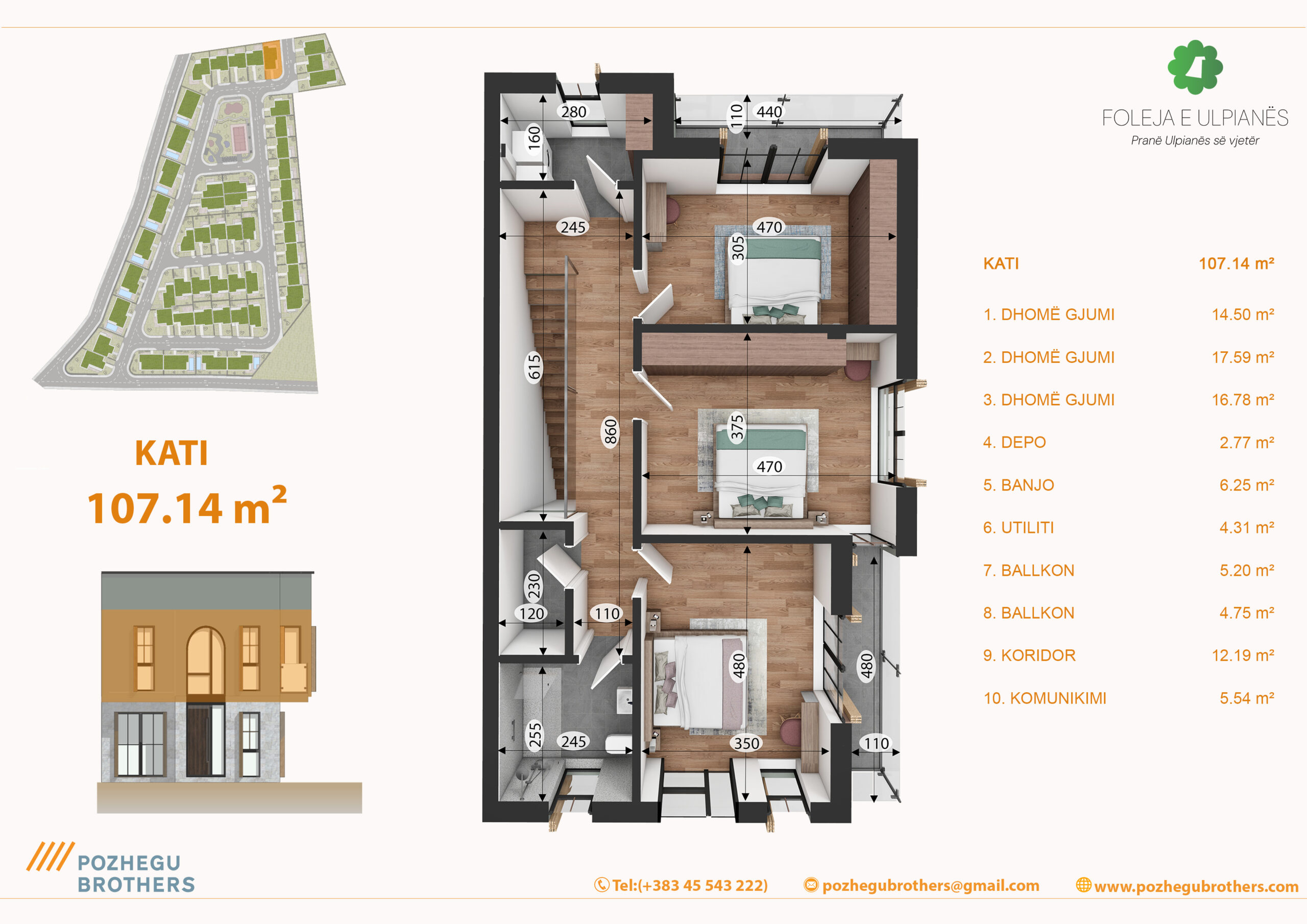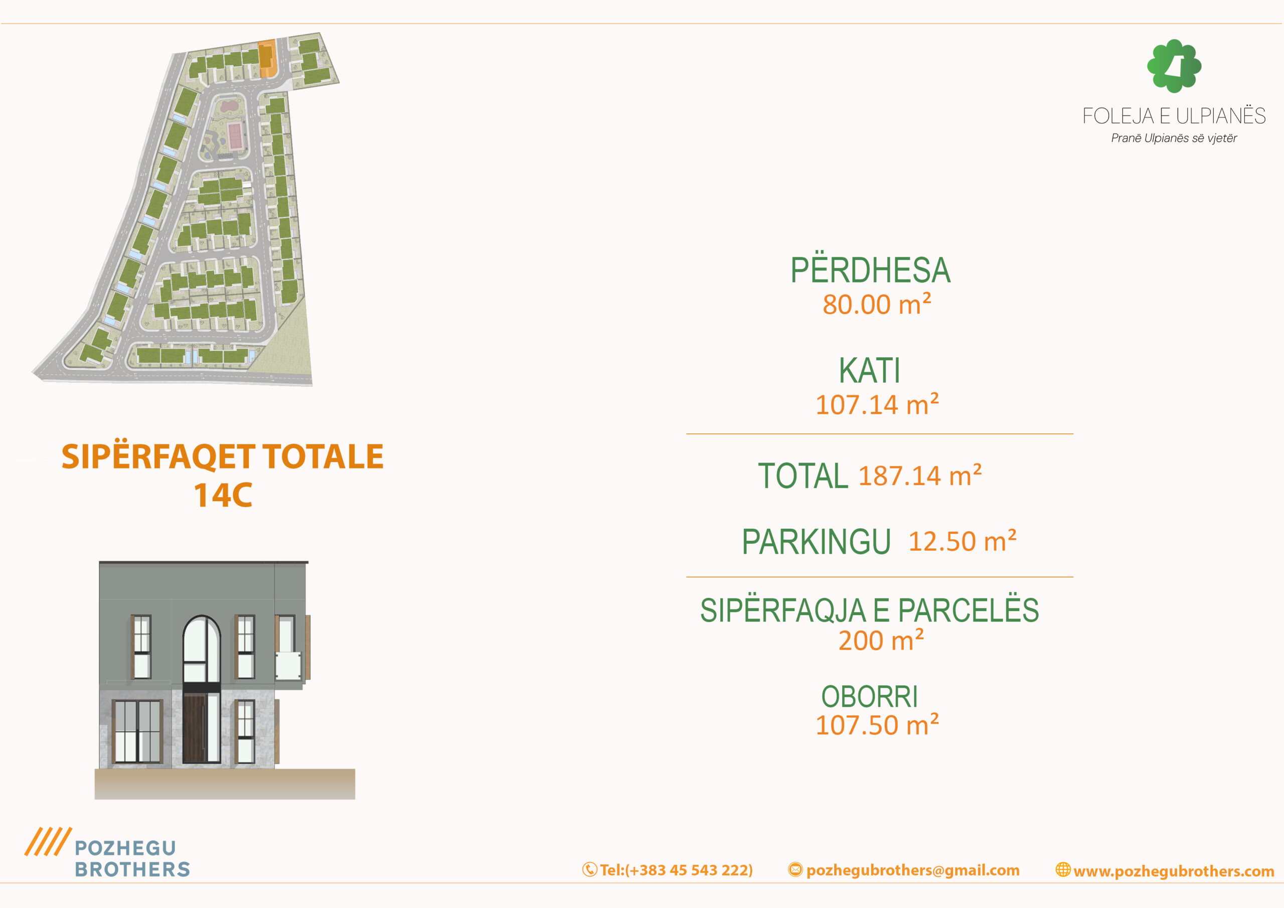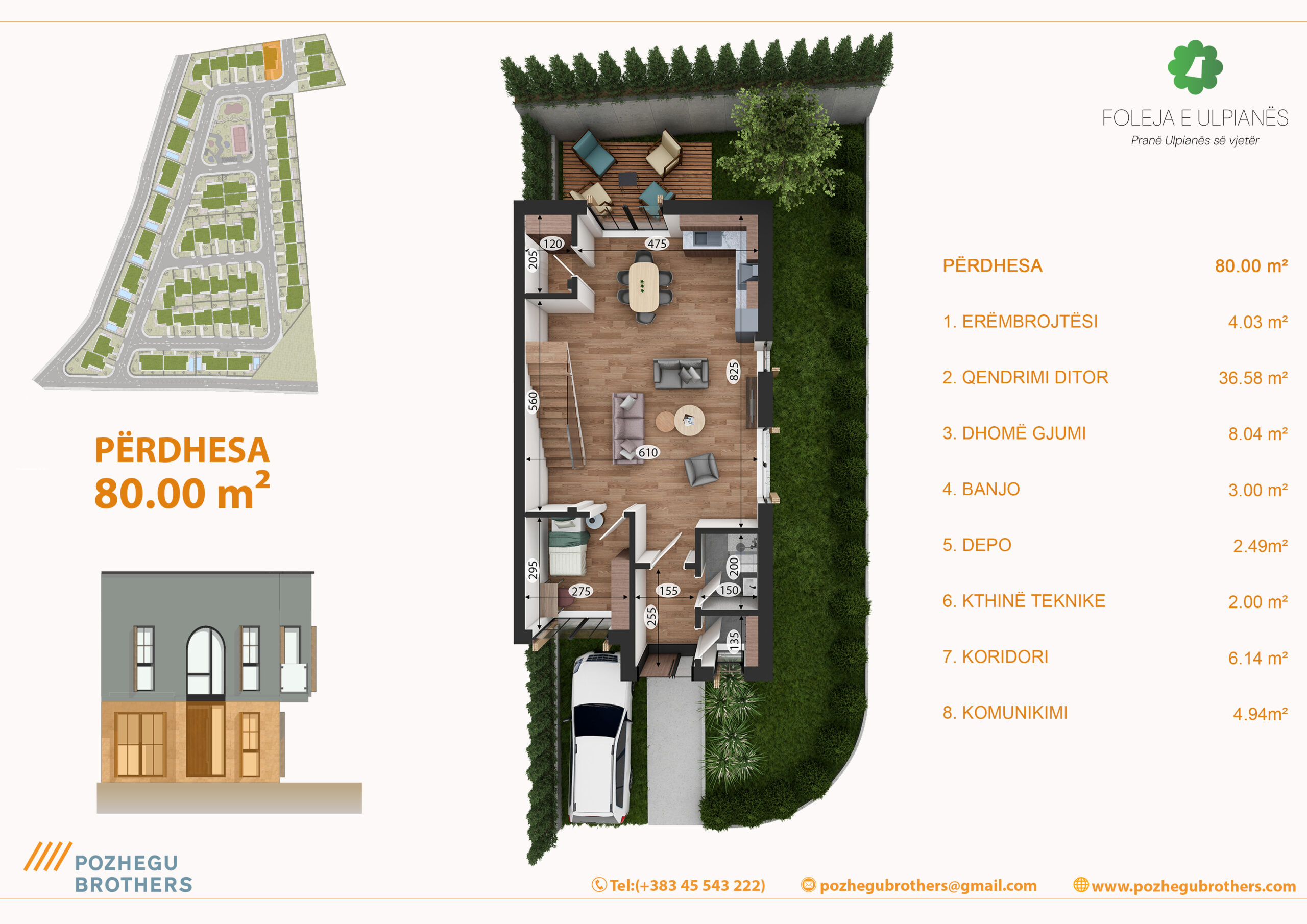 Shtëpia është me dy kate, e organizuar në mënyrë funksionale për jetesë familjare. Kati përdhesë përfshinë hapësirat ditore – sallonin, kuzhinën me tryezari, dhomë gjumi, banjo, depo dhe kthinën teknike . Kati lartë përmban 3 dhoma të gjumit, utilitin, depo, banjon dhe 2 ballkona. Dritaret e mëdha lejojnë ndriçimin natyror të hyjë gjatë gjithë ditës, ndërsa orientimi është i planifikuar për të përfituar maksimalisht nga drita dhe pamja.