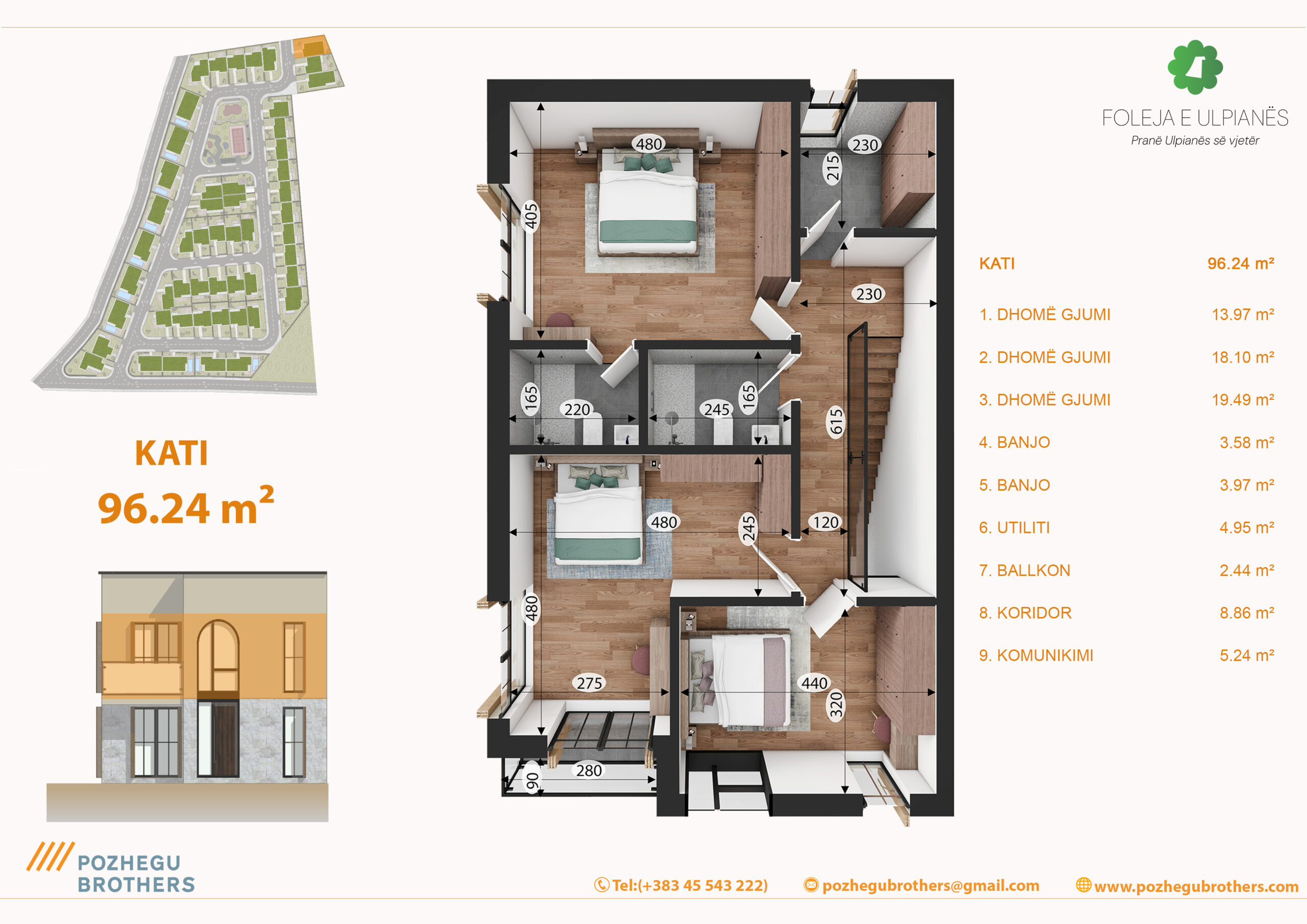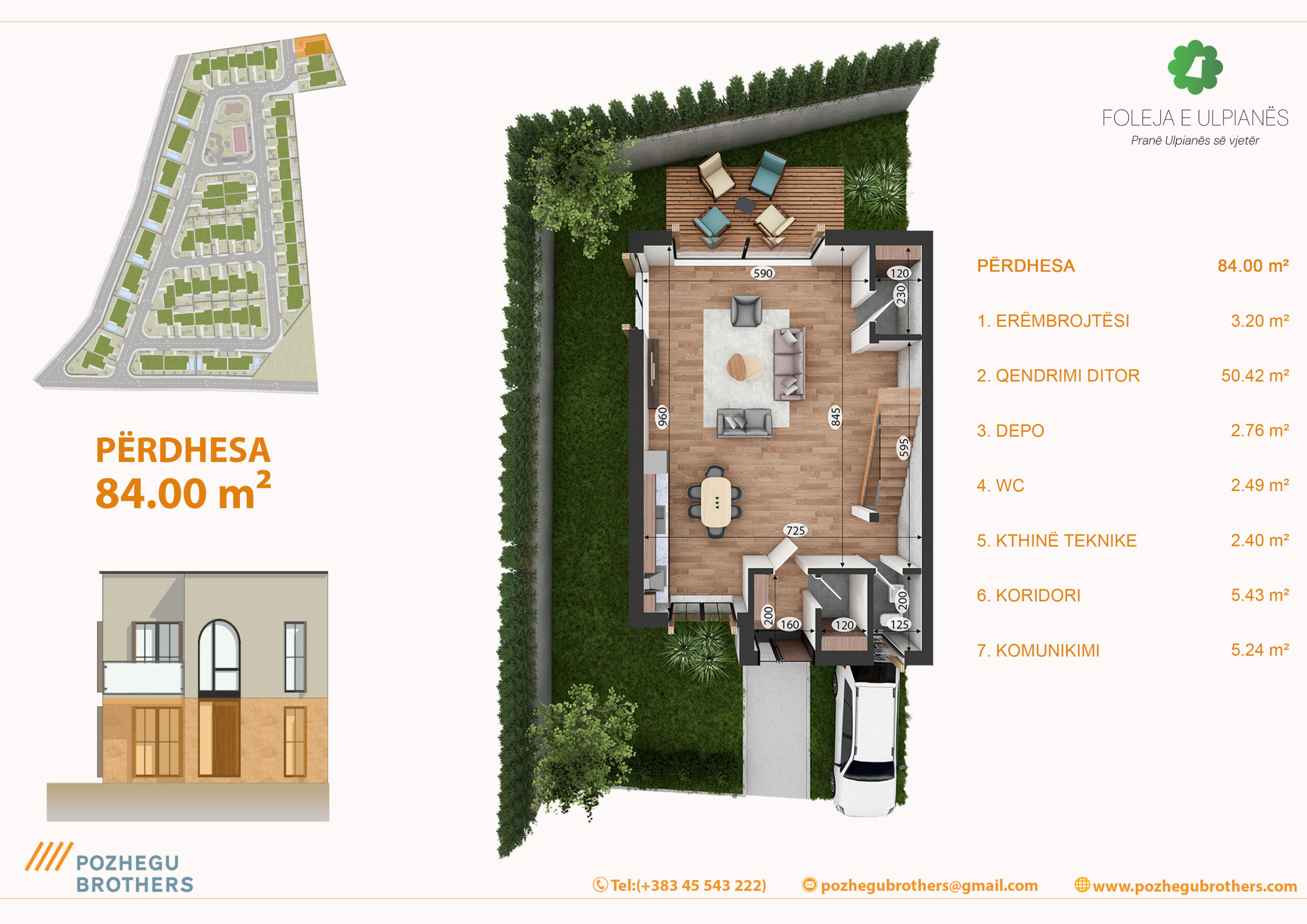 Shtëpia është me dy kate, e organizuar në mënyrë funksionale për jetesë familjare. Kati përdhesë përfshinë hapësirat ditore – sallonin, kuzhinën me tryezari, depo, wc dhe kthinën teknike. Kati lartë përmban 3 dhoma të gjumit, 2 banjo, utilitin dhe ballkonin. Dritaret e mëdha lejojnë ndriçimin natyror të hyjë gjatë gjithë ditës, ndërsa orientimi është i planifikuar për të përfituar maksimalisht nga drita dhe pamja.
