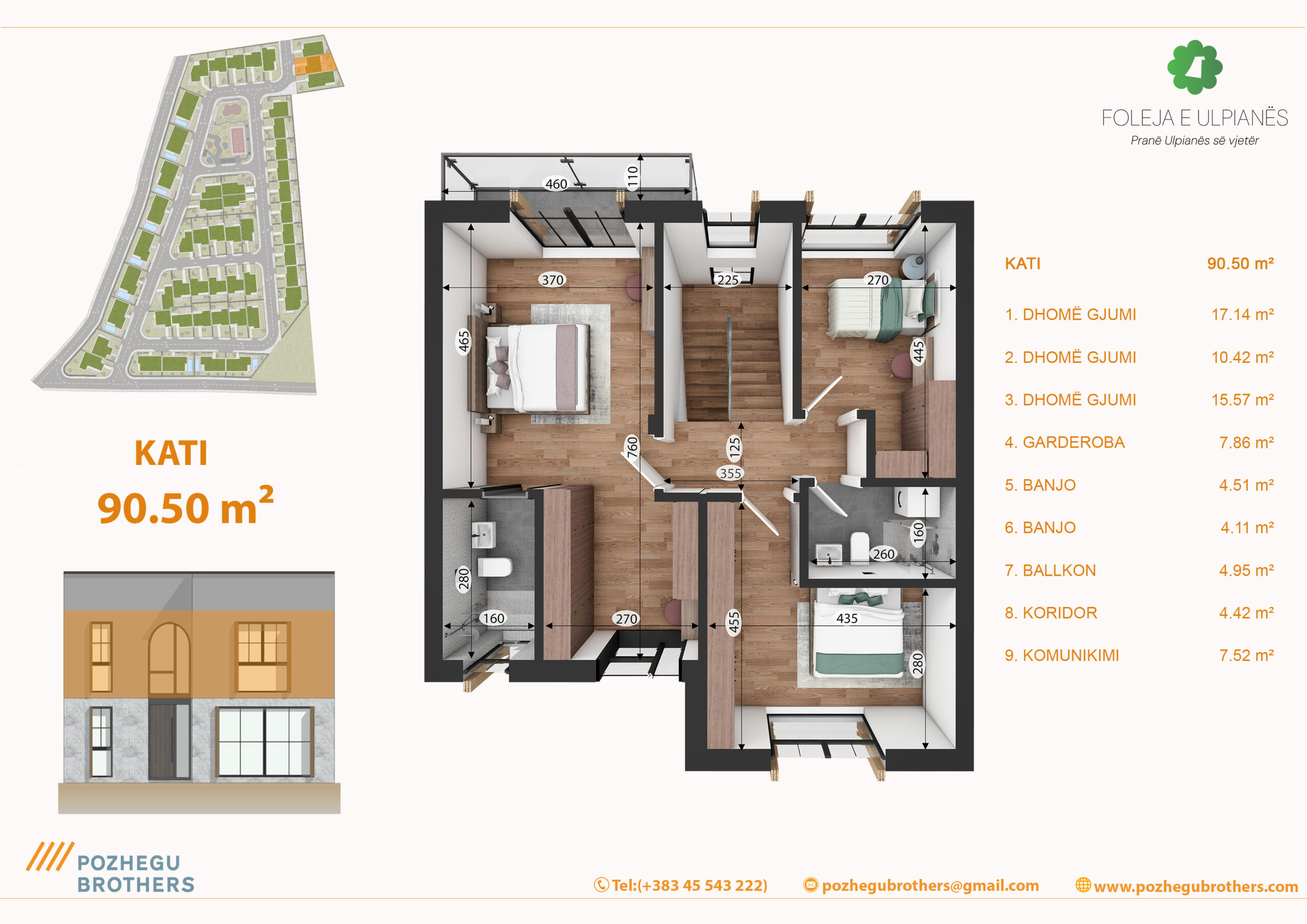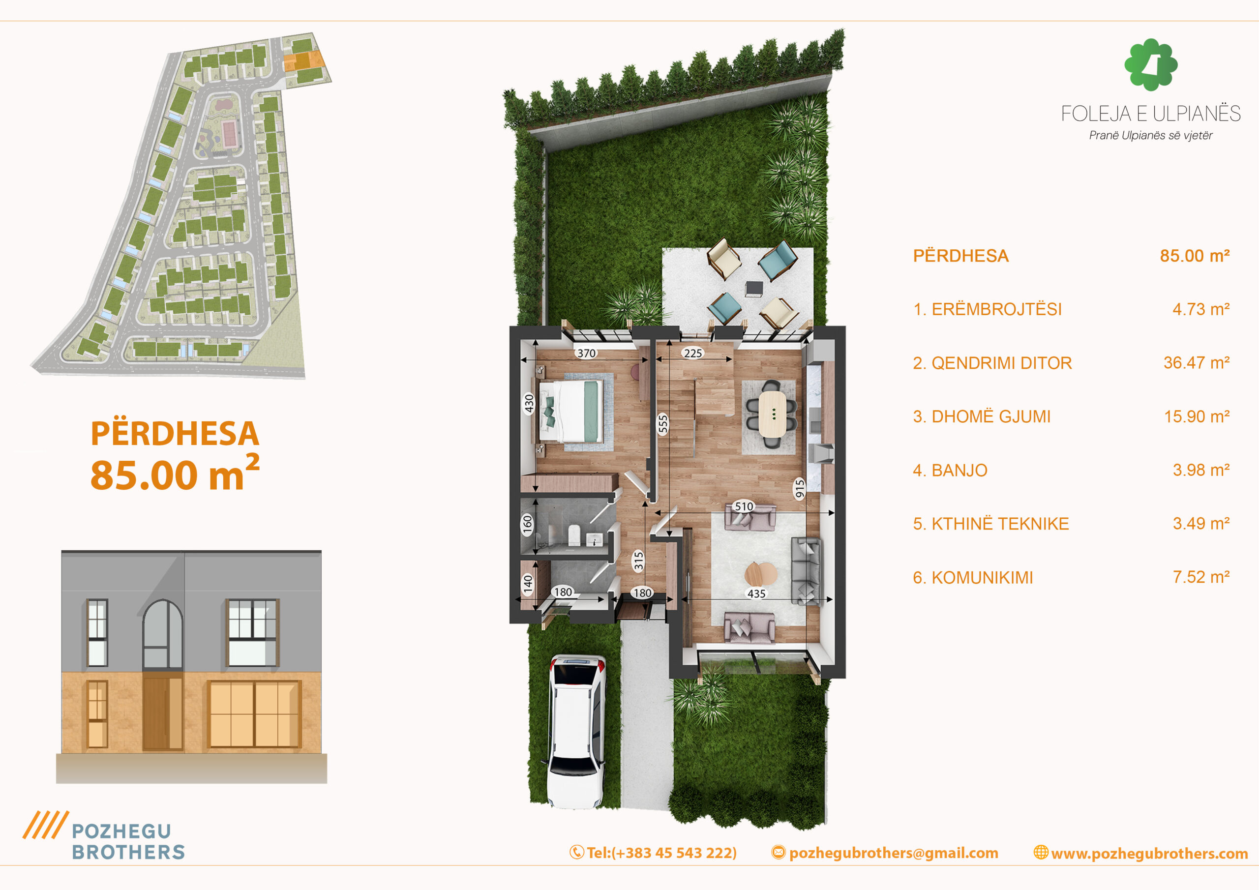 Shtëpia është me dy kate, e organizuar në mënyrë funksionale për jetesë familjare. Kati përdhesë përfshinë hapësirat ditore – sallonin, kuzhinën me tryezari, dhomë gjumi, banjo dhe kthinën teknike . Kati lartë përmban 3 dhoma të gjumit, 2 banjo dhe ballkonin. Dritaret e mëdha lejojnë ndriçimin natyror të hyjë gjatë gjithë ditës, ndërsa orientimi është i planifikuar për të përfituar maksimalisht nga drita dhe pamja.