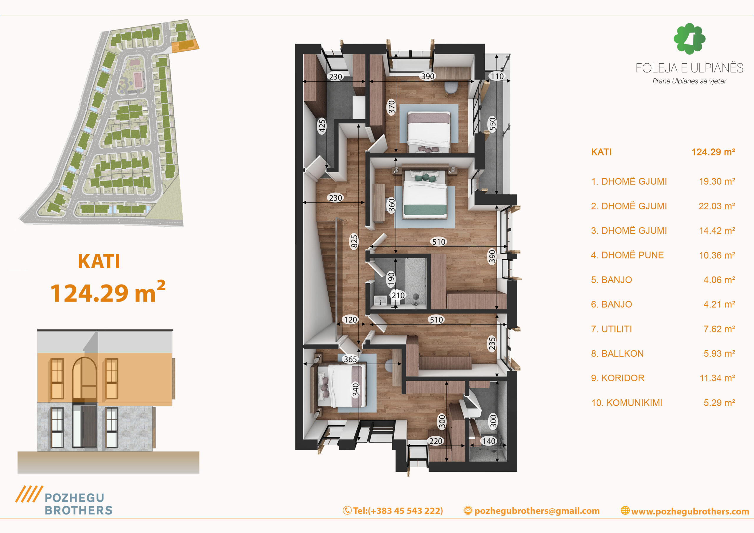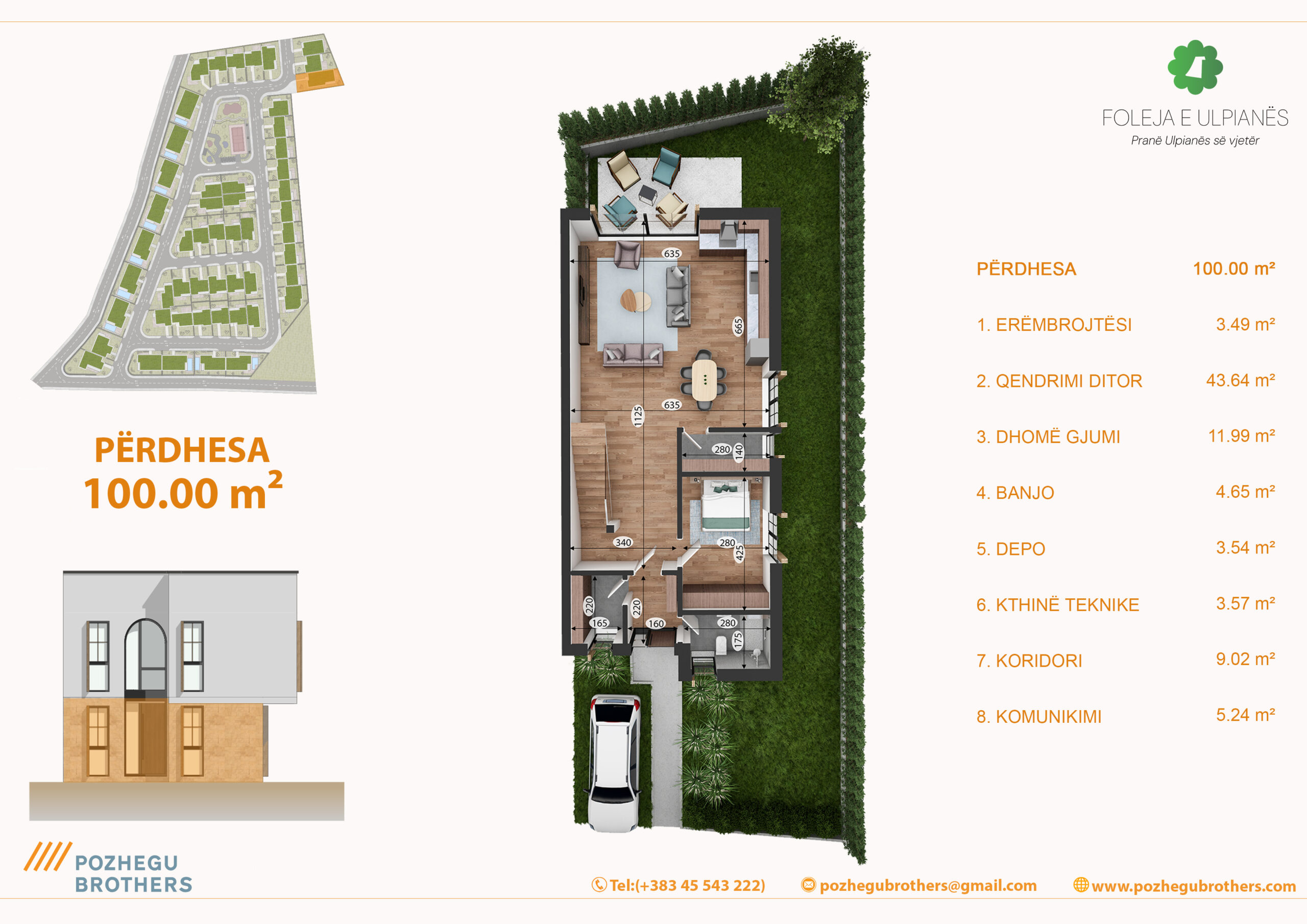 Shtëpia është me dy kate, e organizuar në mënyrë funksionale për jetesë familjare. Kati përdhesë përfshinë hapësirat ditore – sallonin, kuzhinën me tryezari, dhomë gjumi, banjo, depo dhe kthinën teknike. Kati lartë përmban 3 dhoma të gjumit, dhomë pune, 2 banjo, utilitin dhe ballkonin. Dritaret e mëdha lejojnë ndriçimin natyror të hyjë gjatë gjithë ditës, ndërsa orientimi është i planifikuar për të përfituar maksimalisht nga drita dhe pamja.