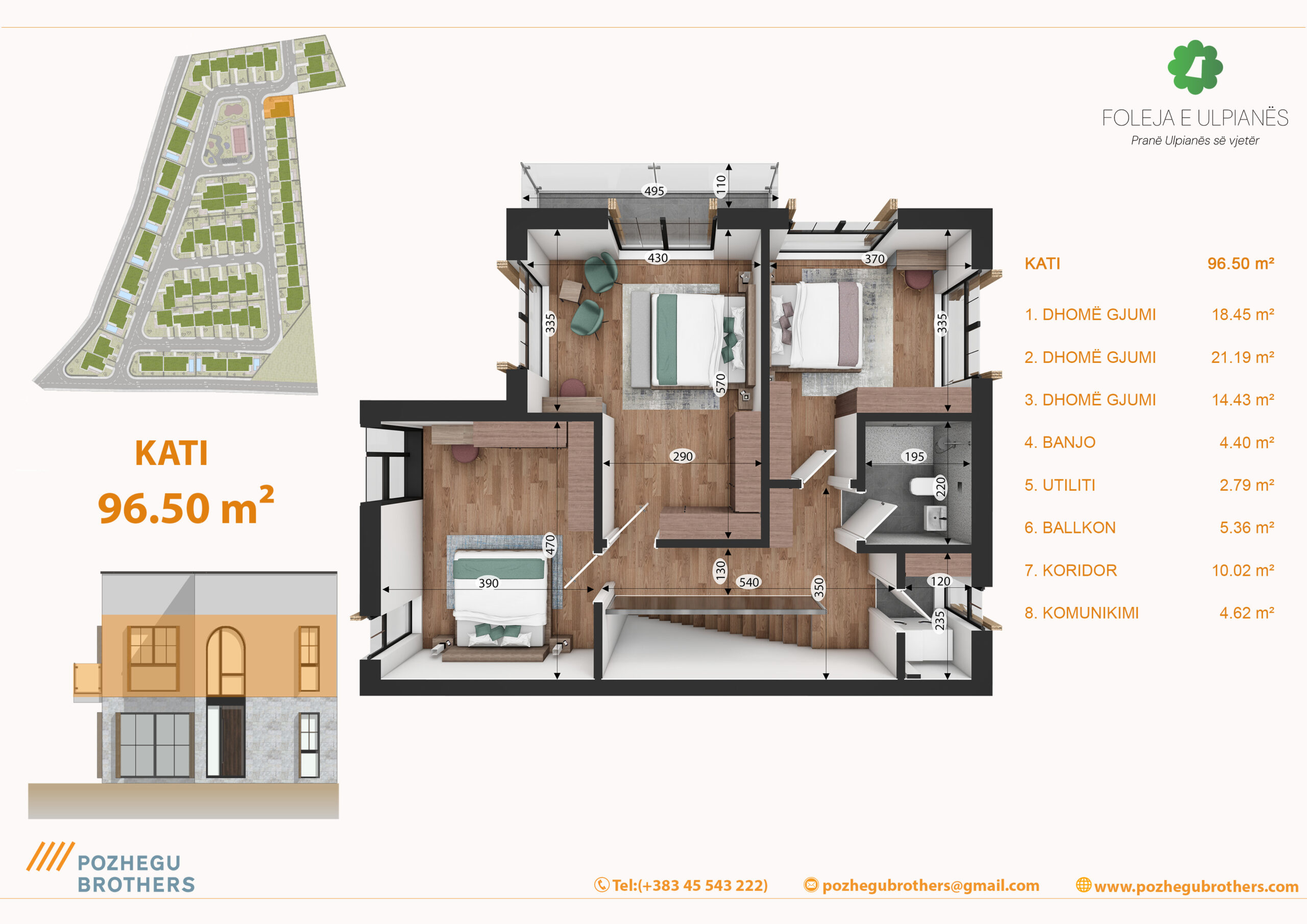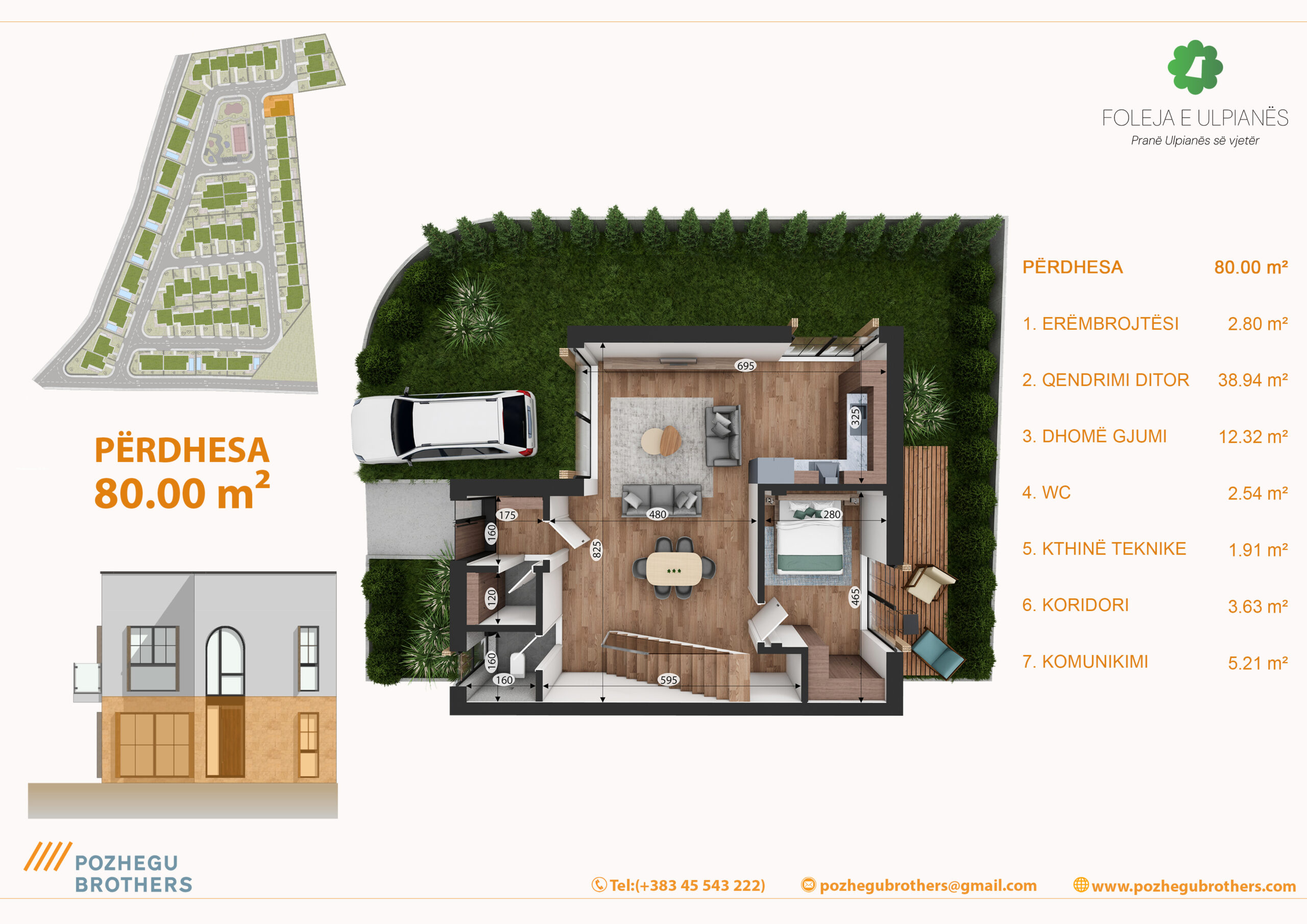 Shtëpia është me dy kate, e organizuar në mënyrë funksionale për jetesë familjare. Kati përdhesë përfshinë hapësirat ditore – sallonin, kuzhinën me tryezari, dhomë gjumi, wc, kthinën teknike . Kati lartë përmban 3 dhoma të gjumit, banjo, utilitin dhe ballkonin. Dritaret e mëdha lejojnë ndriçimin natyror të hyjë gjatë gjithë ditës, ndërsa orientimi është i planifikuar për të përfituar maksimalisht nga drita dhe pamja.