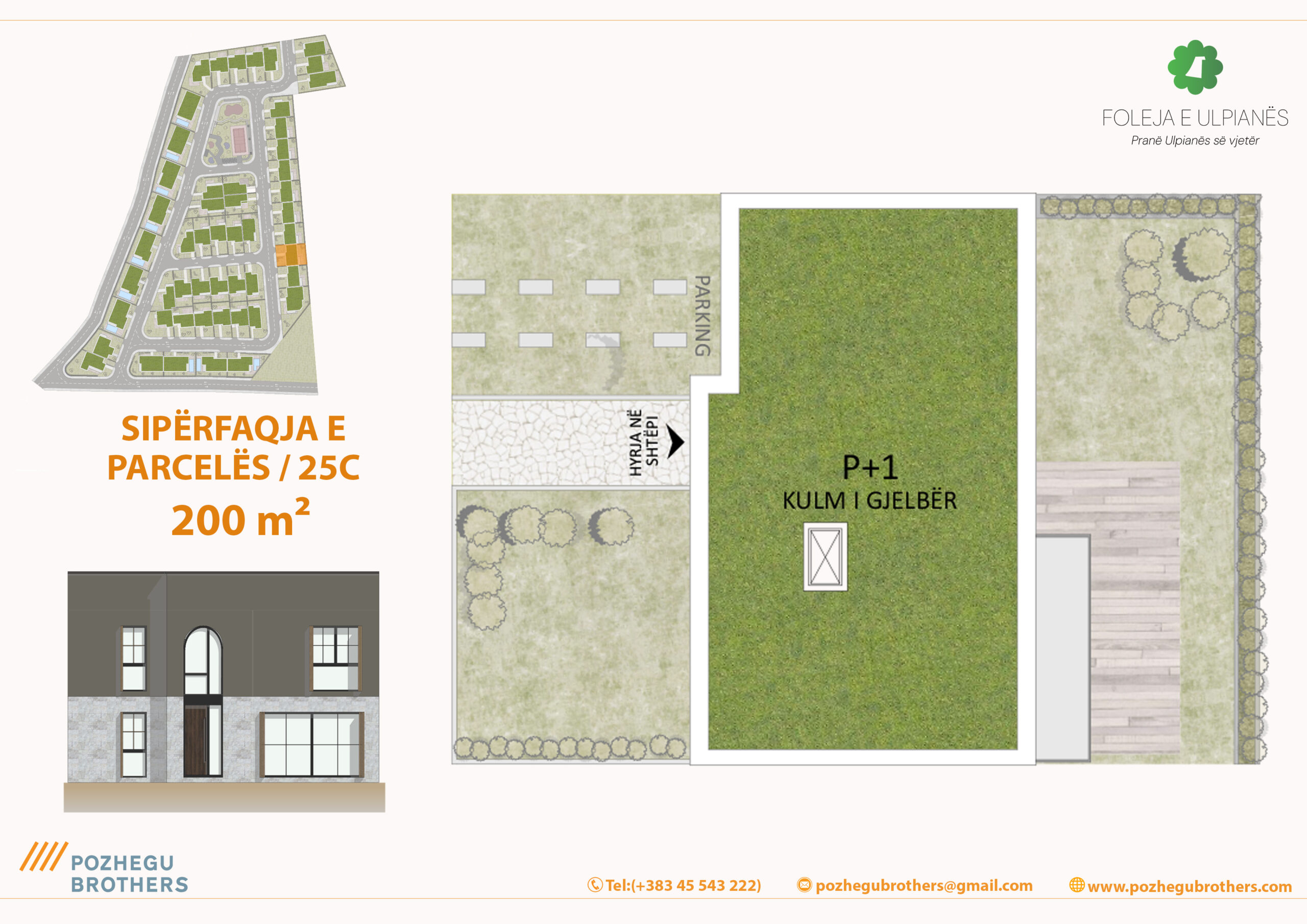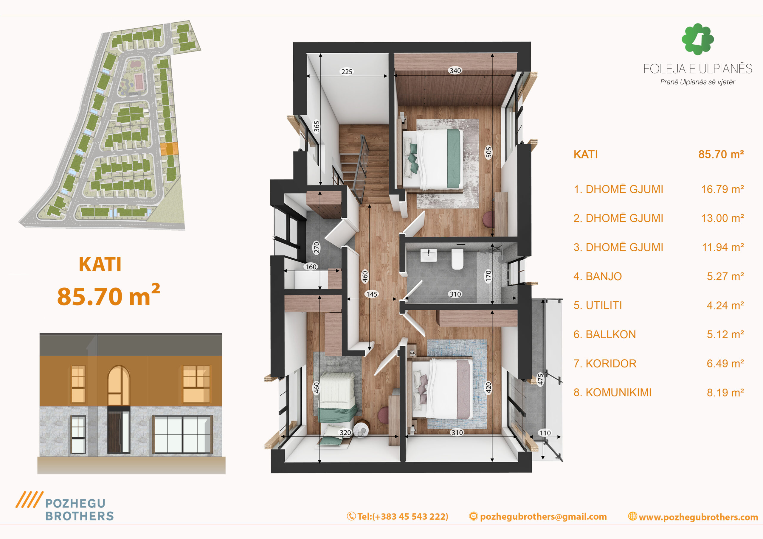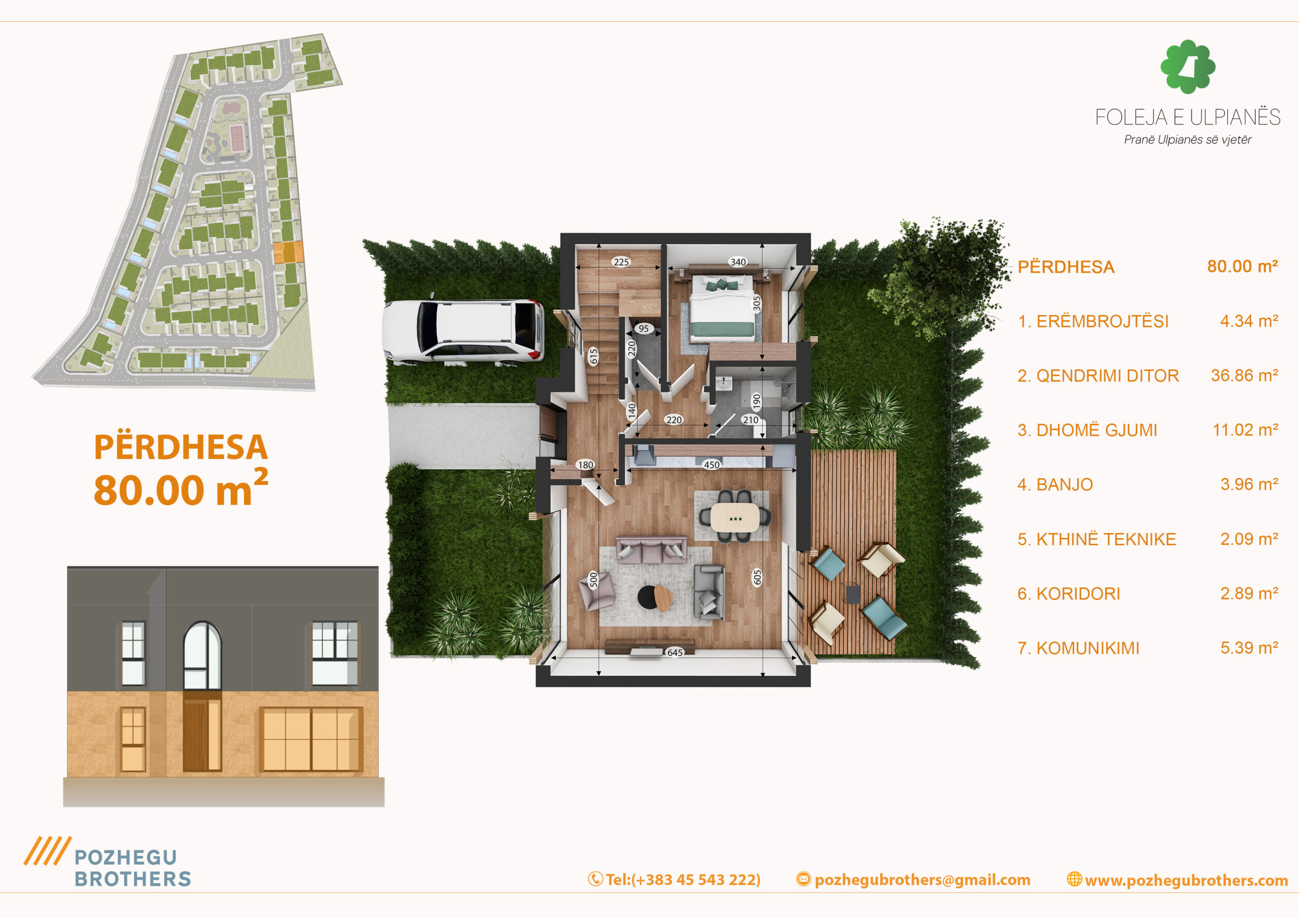 Shtëpia është me dy kate, e organizuar në mënyrë funksionale për jetesë familjare. Kati përdhesë përfshinë hapësirat ditore – sallonin, kuzhinën me tryezari, dhomë gjumi, banjo, dhe kthinën teknike. Kati lartë përmban 3 dhoma të gjumit, banjo, utilitin dhe ballkonin. Dritaret e mëdha lejojnë ndriçimin natyror të hyjë gjatë gjithë ditës, ndërsa orientimi është i planifikuar për të përfituar maksimalisht nga drita dhe pamja.