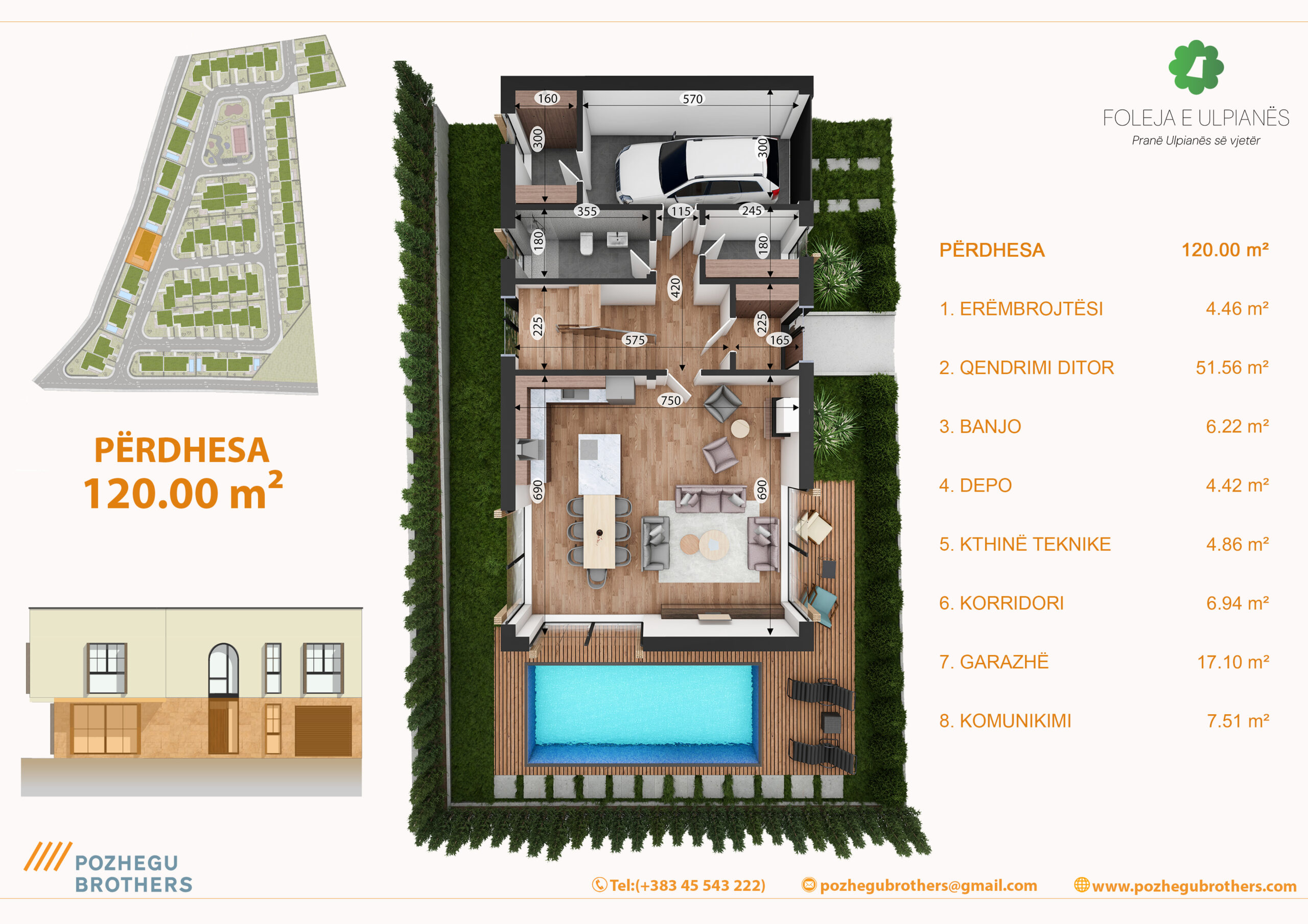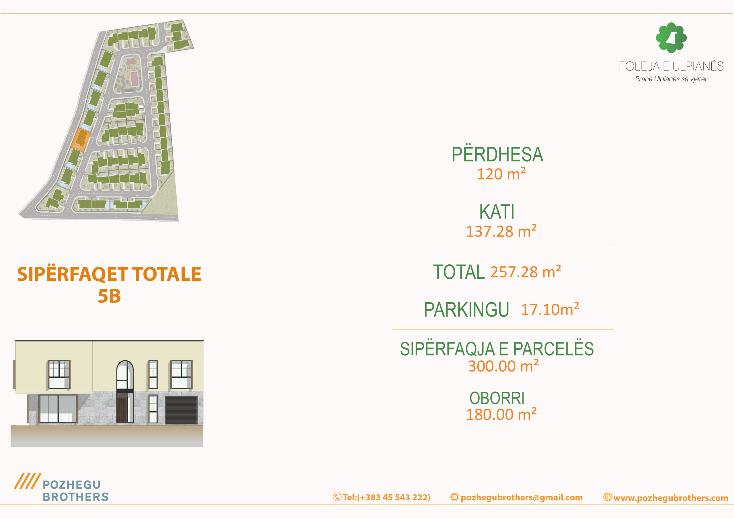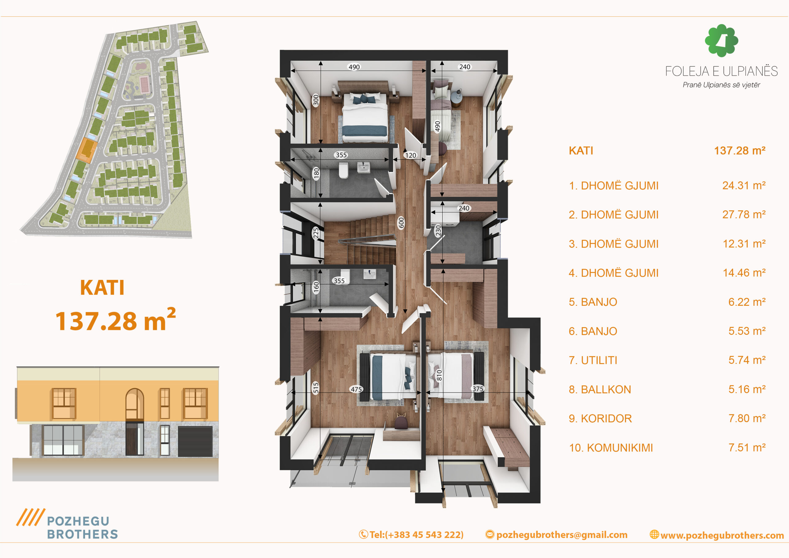 Shtëpia është me dy kate, e organizuar në mënyrë funksionale për jetesë familjare. Kati përdhesë përfshinë hapësirat ditore – sallonin, kuzhinën me tryezari, banjo, depo, kthinën teknike si dhe garazhë. Kati lartë përmban 4 dhoma të gjumit, 2 banjo, utilitin dhe ballkonin. Dritaret e mëdha lejojnë ndriçimin natyror të hyjë gjatë gjithë ditës, ndërsa orientimi është i planifikuar për të përfituar maksimalisht nga drita dhe pamja.