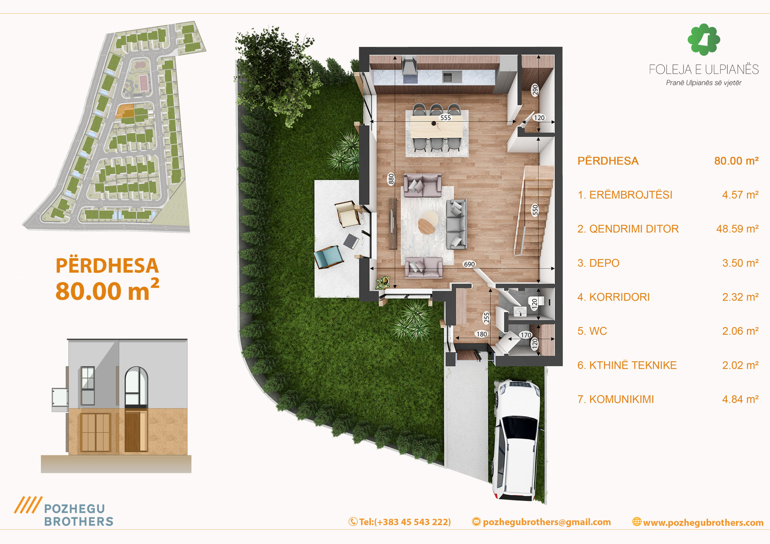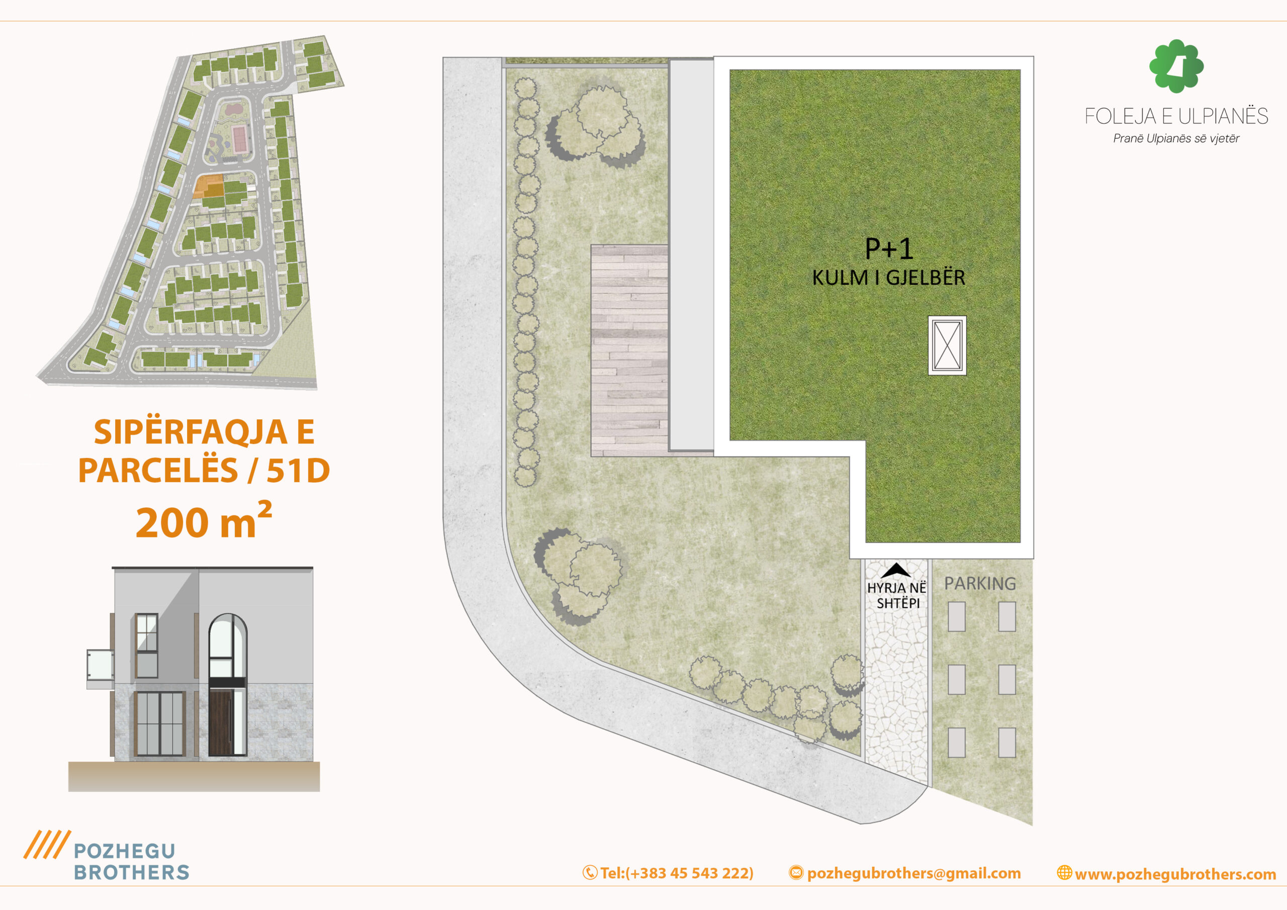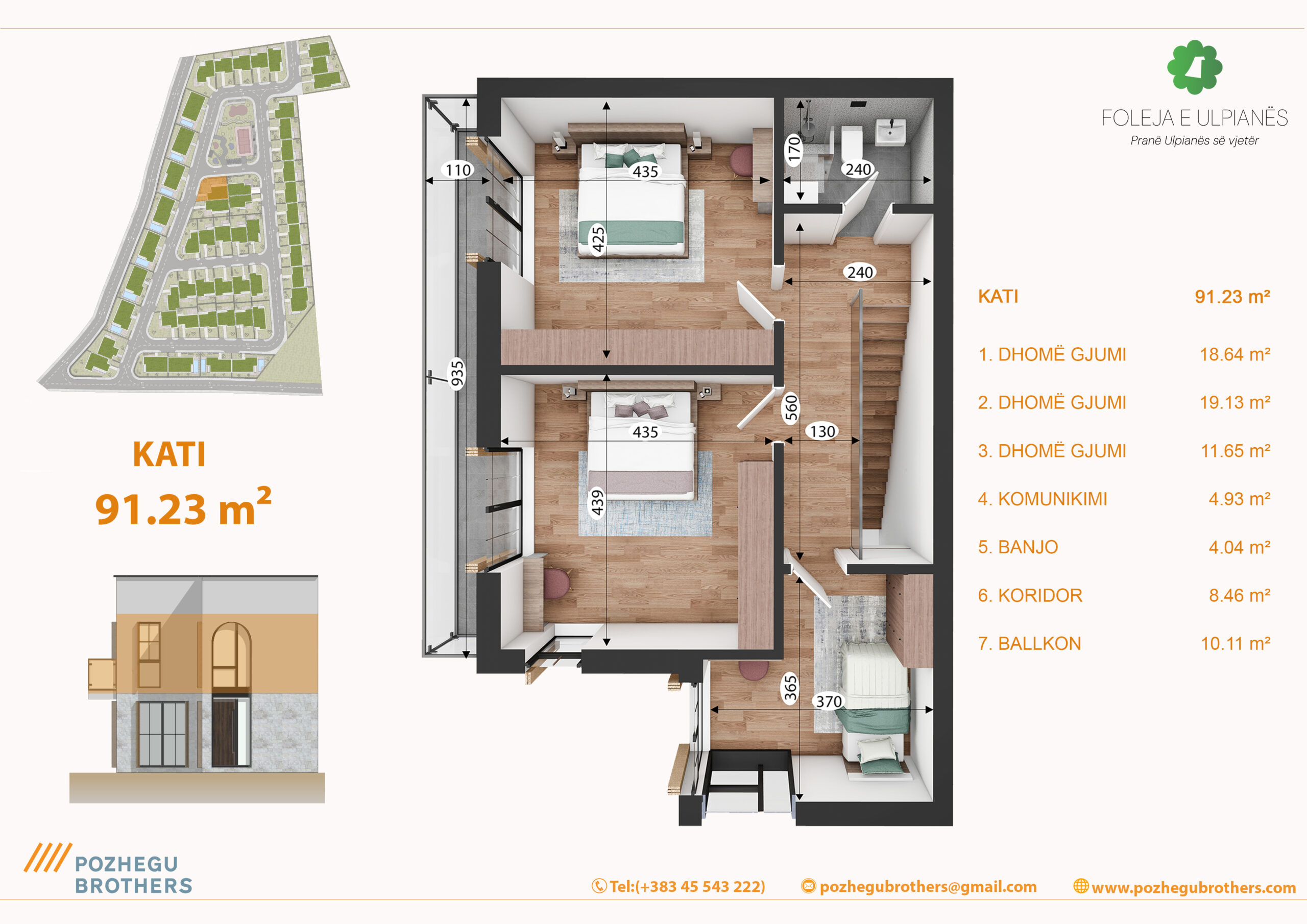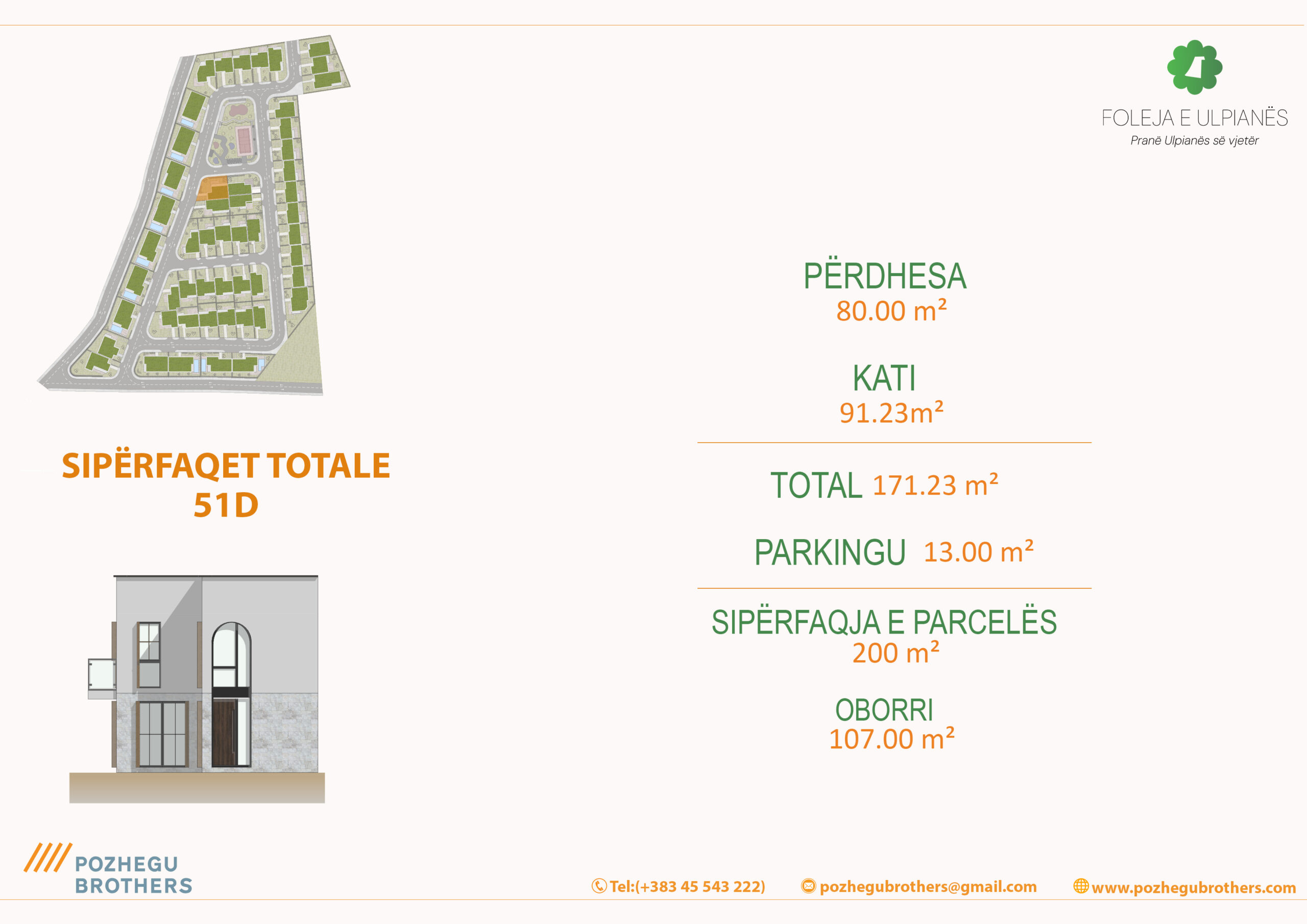 Shtëpia është me dy kate, e organizuar në mënyrë funksionale për jetesë familjare. Kati përdhesë përfshinë hapësirat ditore – sallonin, kuzhinën me tryezari, wc, depo dhe kthinën teknike. Kati lartë përmban 3 dhoma të gjumit, banjo dhe ballkonin. Dritaret e mëdha lejojnë ndriçimin natyror të hyjë gjatë gjithë ditës, ndërsa orientimi është i planifikuar për të përfituar maksimalisht nga drita dhe pamja.