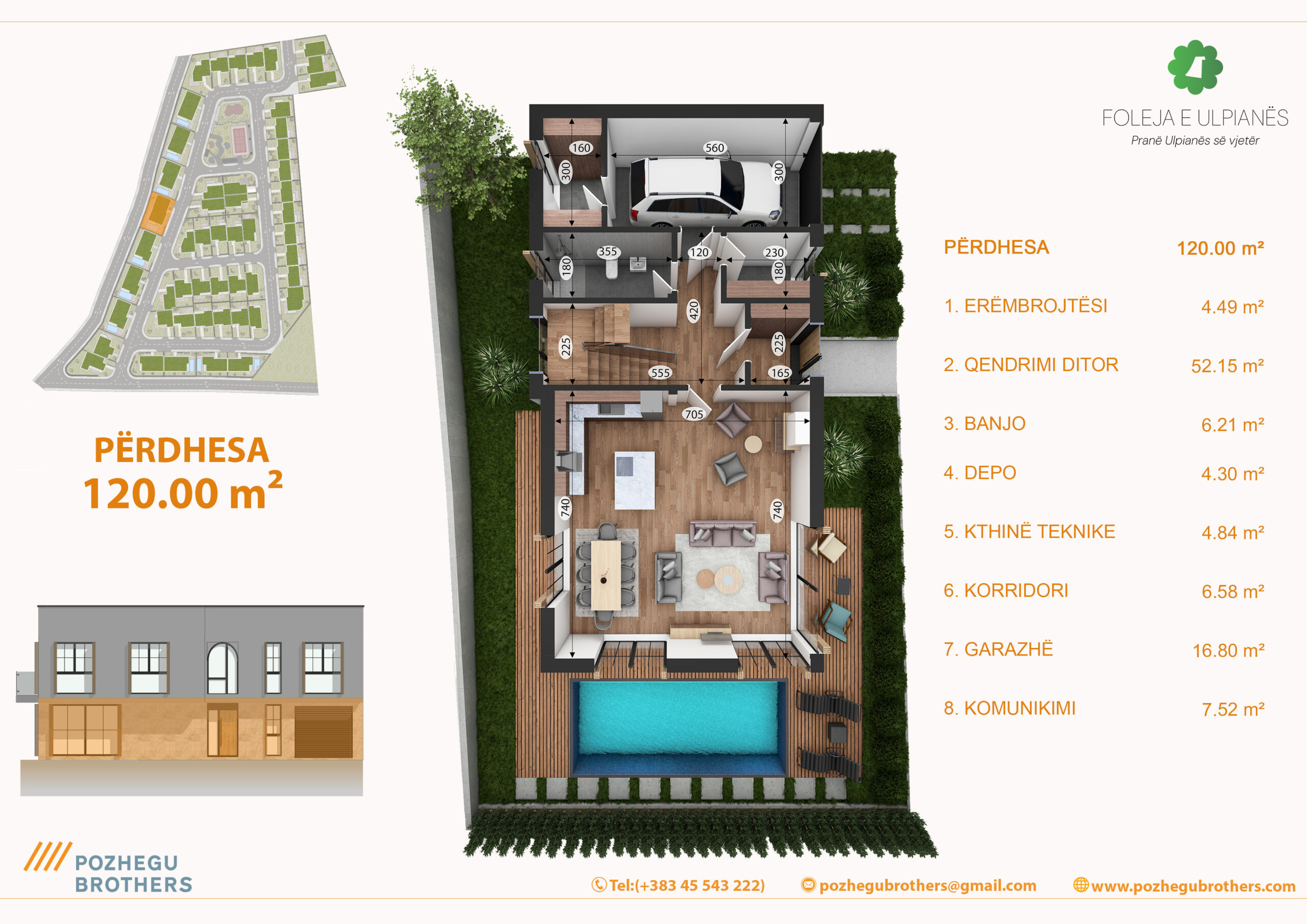 Shtëpia është me dy kate, e organizuar në mënyrë funksionale për jetesë familjare. Kati përdhesë përfshinë hapësirat ditore – sallonin, kuzhinën me tryezari, banjo, depo, kthinën teknike si dhe garazhë. Kati lartë përmban 4 dhoma të gjumit, 2 banjo, utilitin dhe ballkonin. Dritaret e mëdha lejojnë ndriçimin natyror të hyjë gjatë gjithë ditës, ndërsa orientimi është i planifikuar për të përfituar maksimalisht nga drita dhe pamja.
