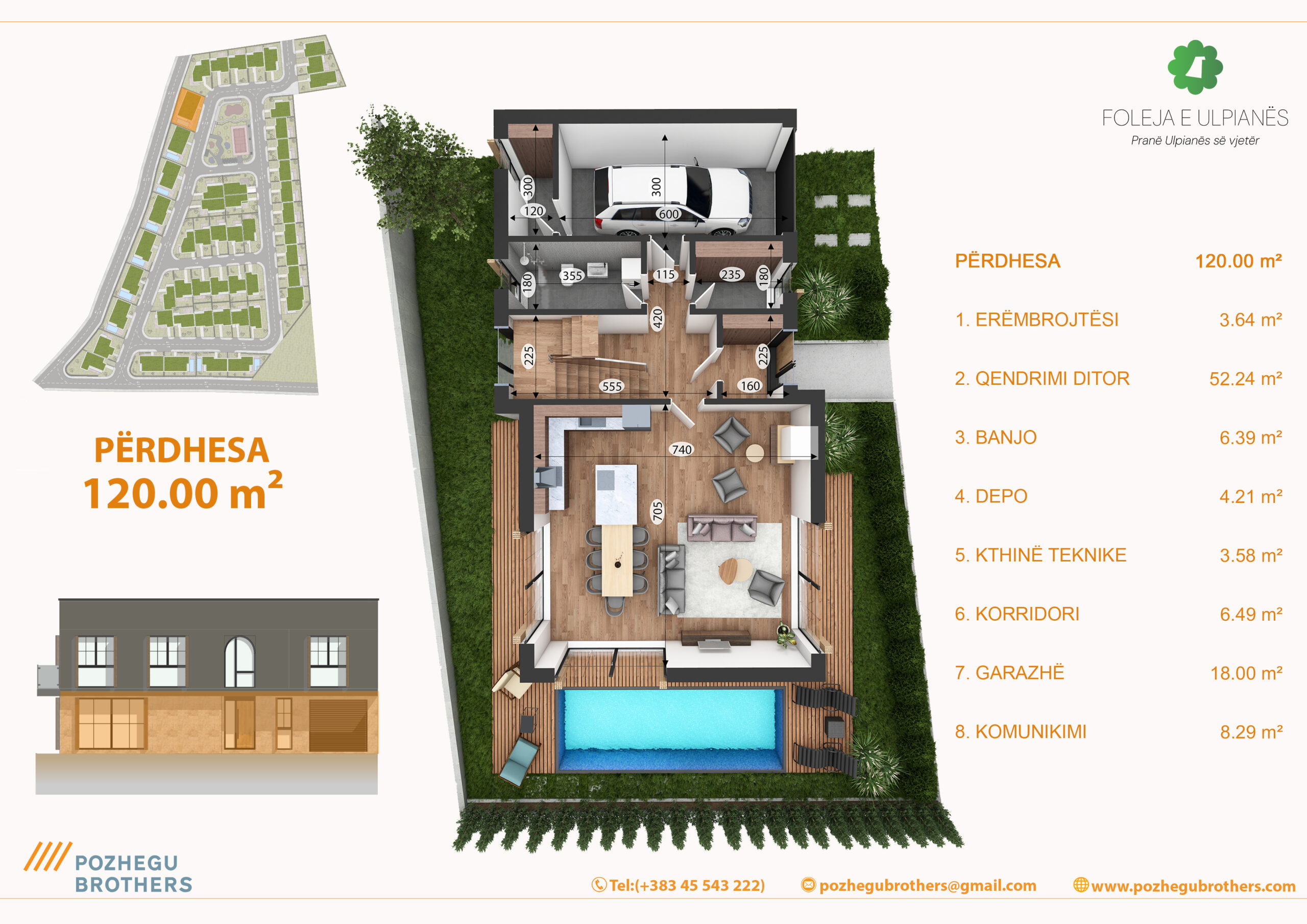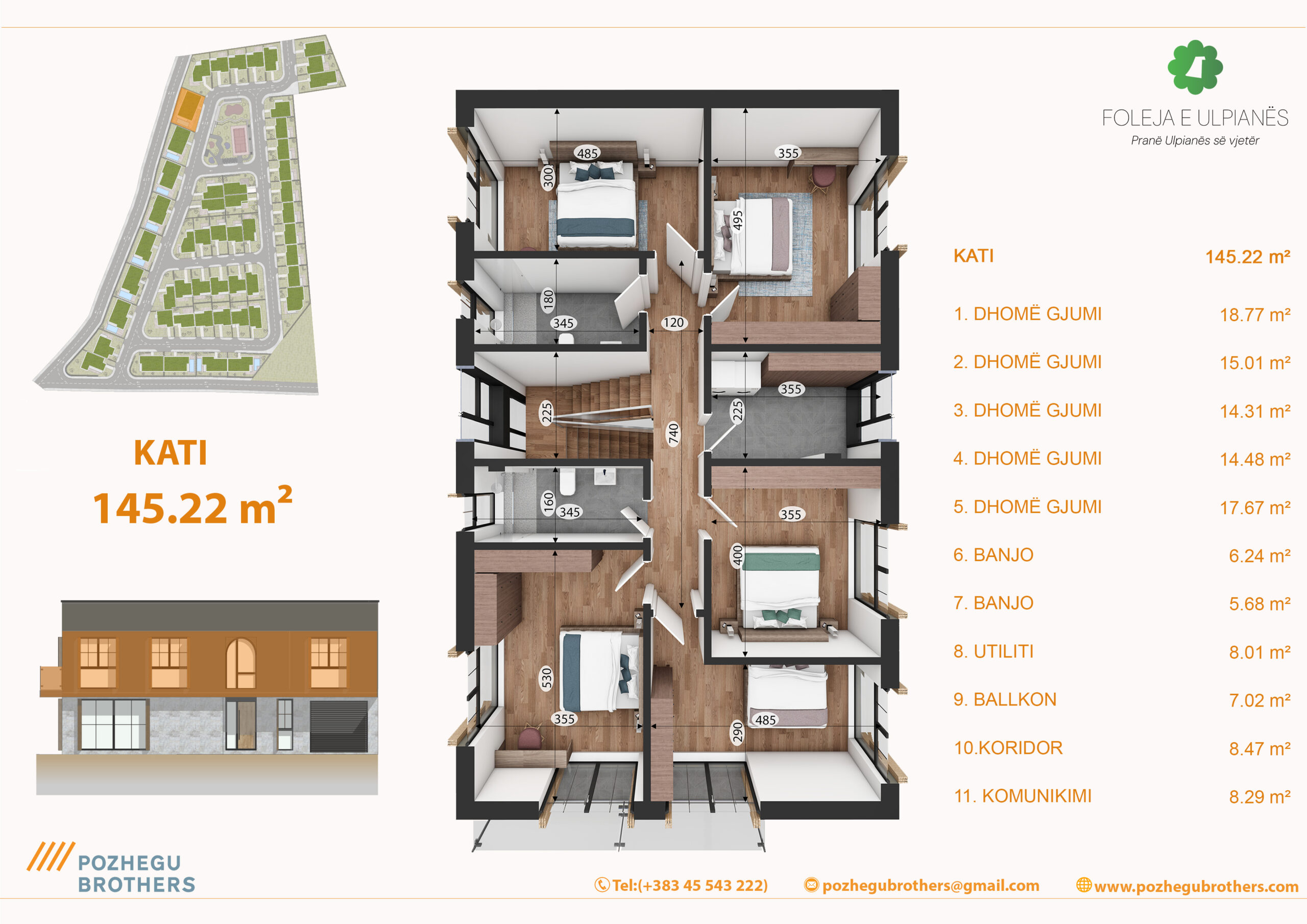 Shtëpia është me dy kate, e organizuar në mënyrë funksionale për jetesë familjare. Kati përdhesë përfshinë hapësirat ditore – sallonin, kuzhinën me tryezari, banjo, depo, kthinën teknike si dhe garazhë. Kati lartë përmban 5 dhoma të gjumit, 2 banjo, utilitin dhe ballkonin. Dritaret e mëdha lejojnë ndriçimin natyror të hyjë gjatë gjithë ditës, ndërsa orientimi është i planifikuar për të përfituar maksimalisht nga drita dhe pamja.