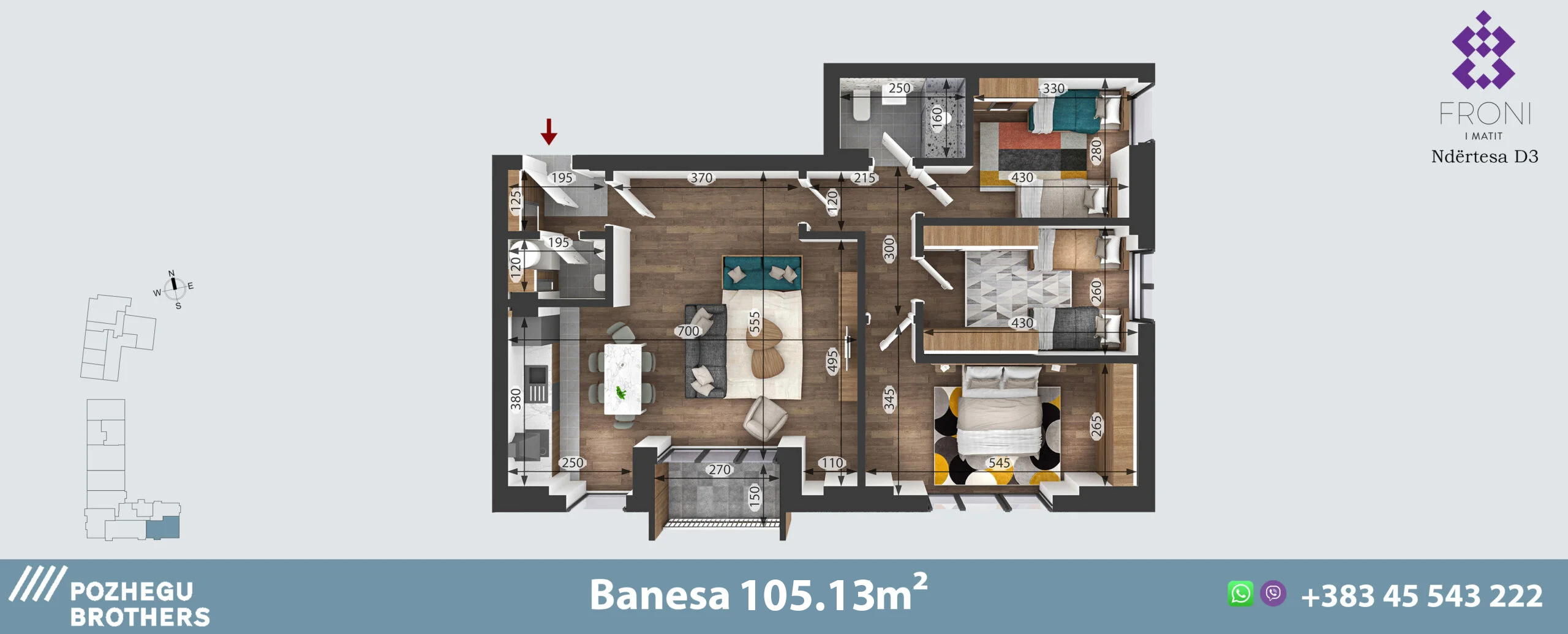 Banesat e këtij tipi janë standarde të planifikuara dhe dizajnuara për familje deri në 5 antarë. Me pamje drejtë parkut të objektit, banesa ka perspektivë perfekte. E përbërë nga 3 dhoma gjumi, 1 banjo, 1 WC, kuzhinën e bashkangjitur në dhomën e ditës dhe ballkonin, kjo banesë formon gjithsej 105.13m².