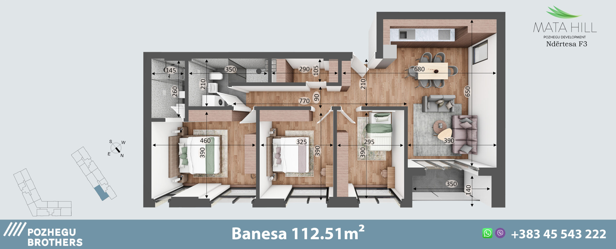 Banesat e këtij tipi janë standarde të planifikuara dhe dizajnuara për familje deri në 5 antarë. Me pamje drejtë rrugës kryesore prej të cilës e ndan një shirit i gjatë gjelbërimi, banesa ka perspektivë perfekte. E përbërë nga 3 dhoma gjumi, 2 banjo, 1 Depo, kuzhinën e bashkangjitur në dhomën e ditës dhe ballkonin, kjo banesë formon gjithsej 112.51m².