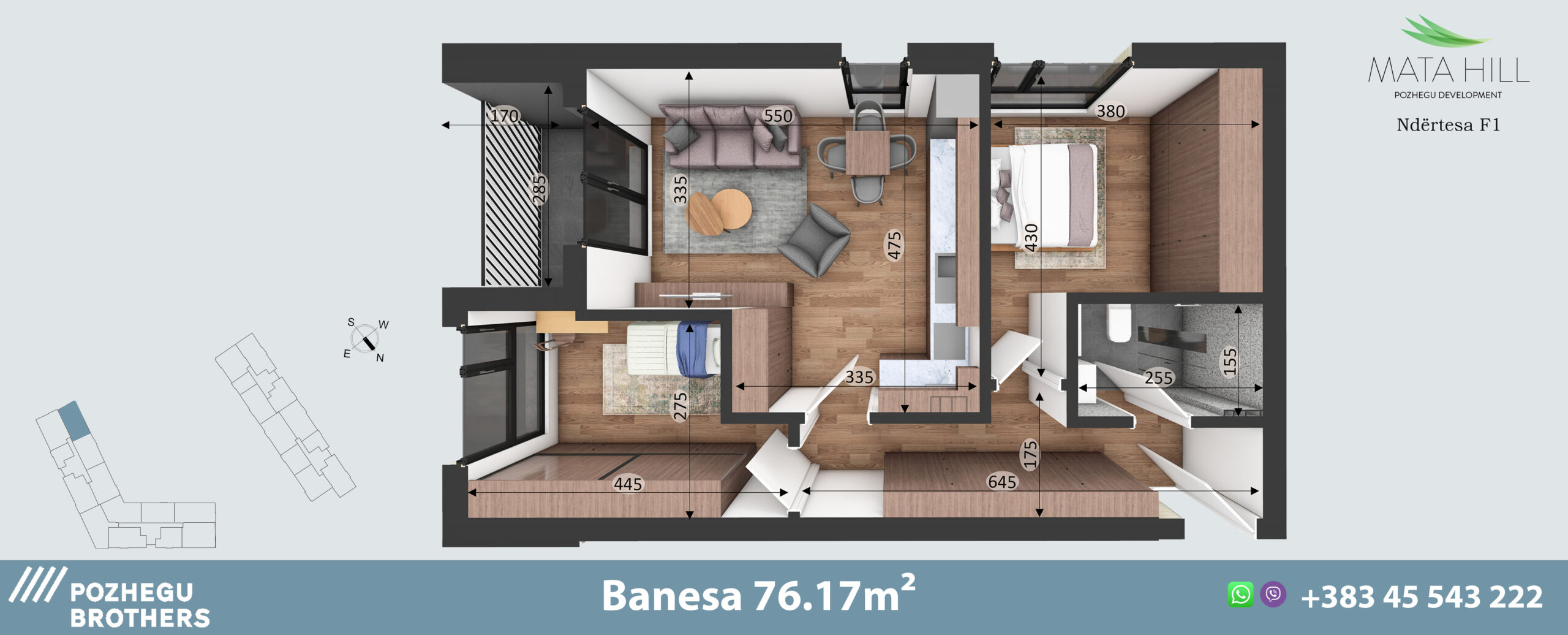 Banesat e këtij tipi janë standarde të planifikuara dhe dizajnuara për familje deri në 4 antarë. Me pamje drejtë parkut të objektit, banesa ka perspektivë perfekte me orientimin drejtë Perëndimit . E përbërë nga 2 dhoma gjumi, 1 banjo, 1 Wc, kuzhinën e bashkangjitur në dhomën e ditës dhe ballkonin, kjo banesë formon gjithsej 76.17m².