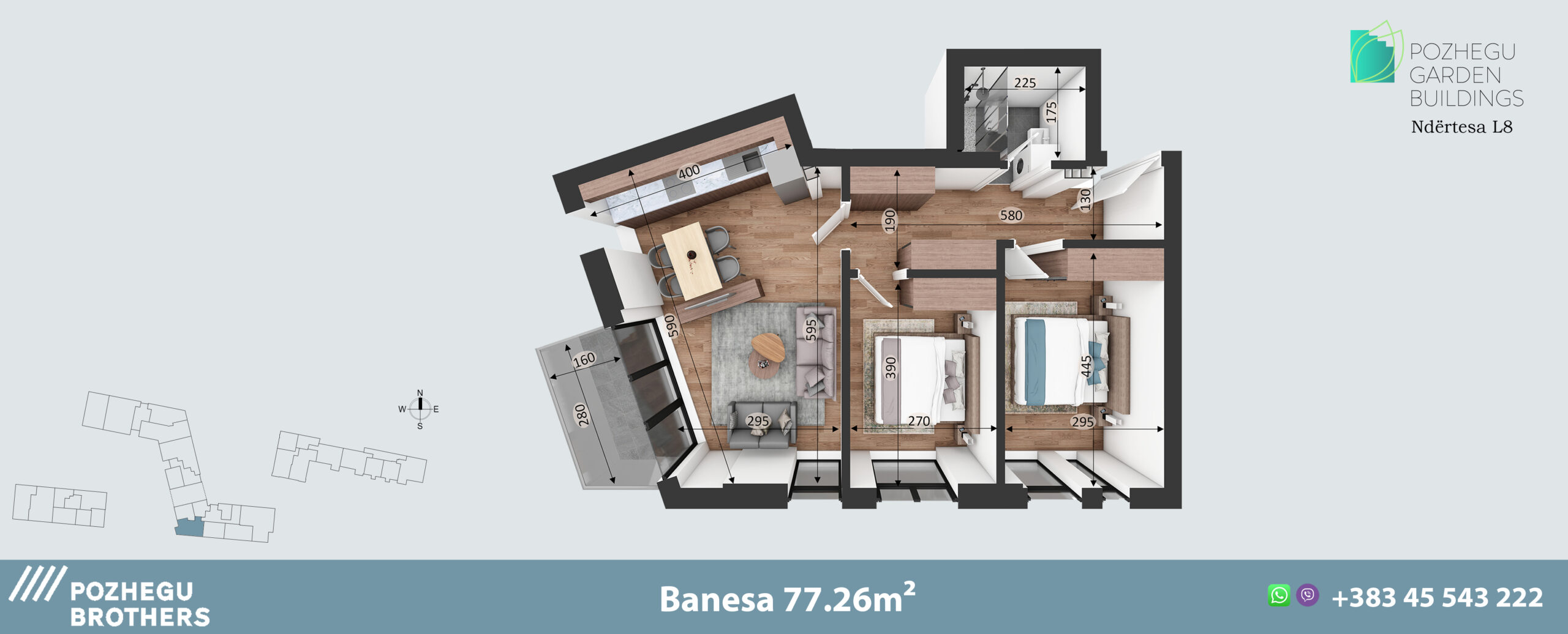 Banesat e këtij tipi janë standarde të planifikuara dhe dizajnuara për familje deri në 3 antarë. Me pamje drejtë rrugë kryesore dhe parkut të kompleksit, banesa ka perspektivë perfekte me orientimin drejtë Jug. E përbërë nga 2 dhome gjumi, 1 banjo, si dhe kuzhinën e bashkangjitur në dhomën e ditës dhe ballkonin, kjo banesë formon gjithsej 77.26m².