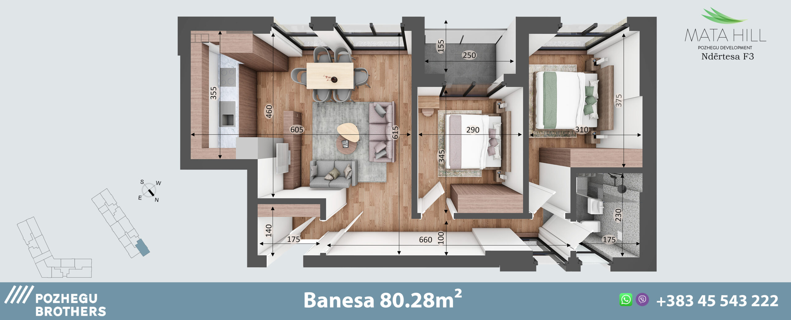 Banesat e këtij tipi janë standarde të planifikuara dhe dizajnuara për familje deri në 5 antarë. Me pamje drejtë rrugës kryesore prej të cilës e ndan një shirit i gjatë gjelbërimi, banesa ka perspektivë perfekte. E përbërë nga 3 dhoma gjumi, 1 banjo, 1WC, kuzhinën e bashkangjitur në dhomën e ditës dhe ballkonin, kjo banesë formon gjithsej 80.28m².