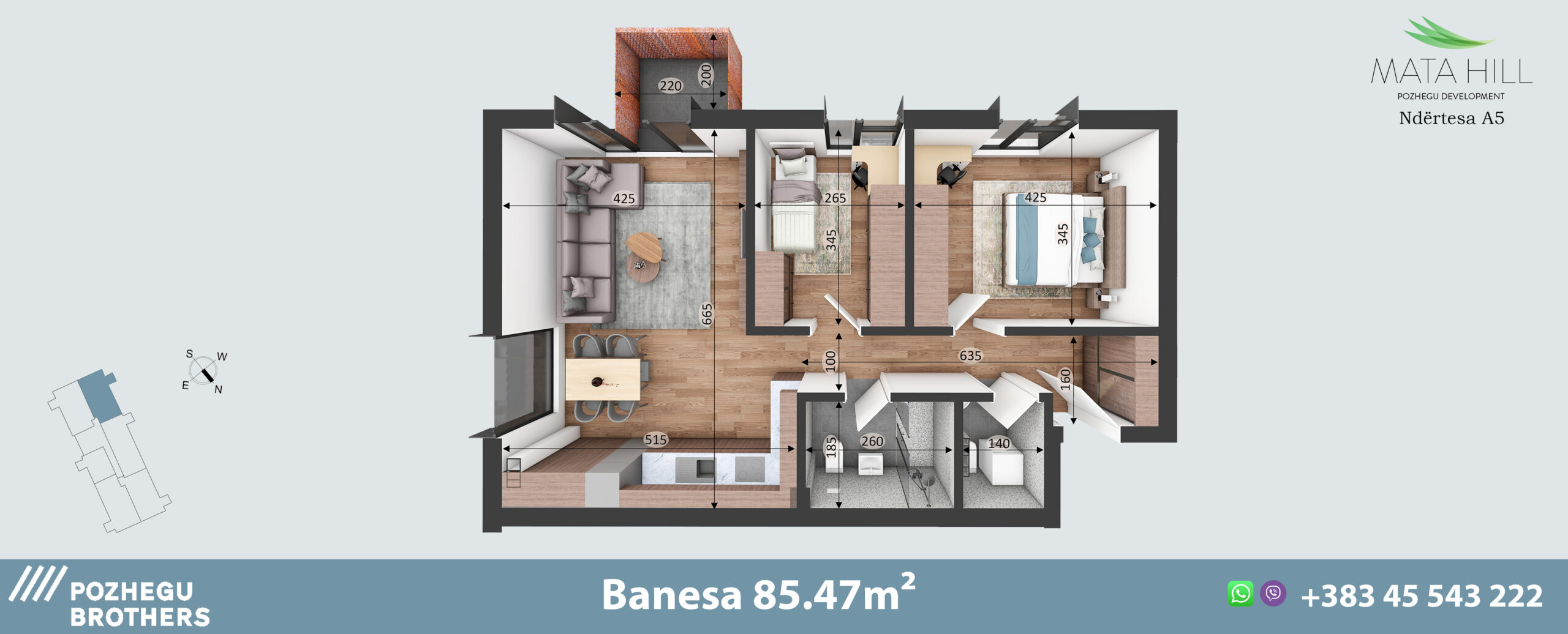 Banesat e këtij tipi janë standarde të planifikuara dhe dizajnuara për familje deri në 5 antarë. Me pamje drejtë parkut të objektit, banesa ka perspektivë perfekte me orientim. E përbërë nga 2 dhoma gjumi, 1 banjo, 1 WC, kuzhinën e bashkangjitur në dhomën e ditës dhe ballkonin, kjo banesë formon gjithsej 85.47m².